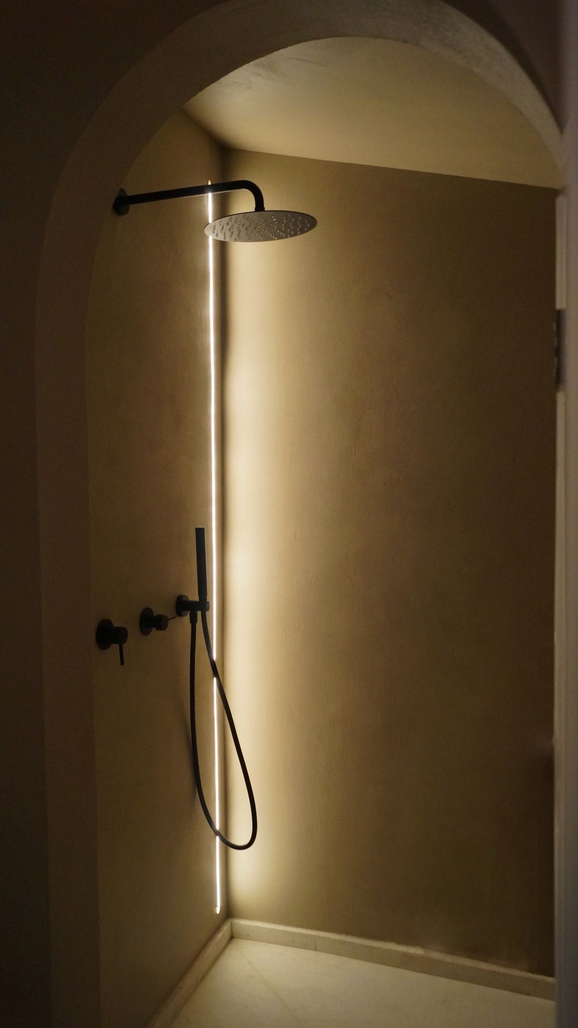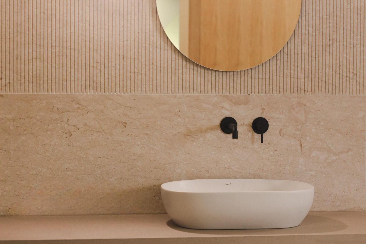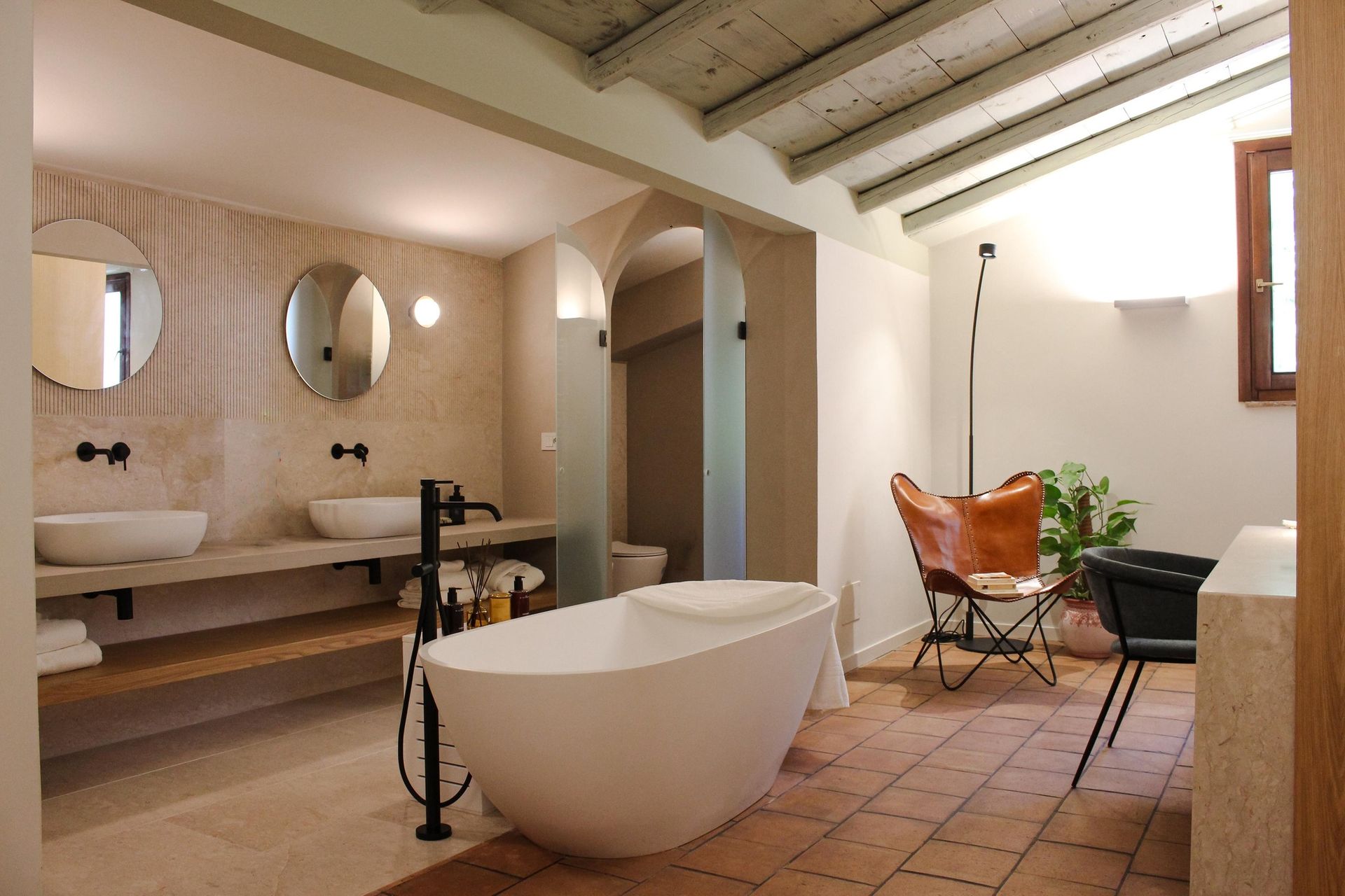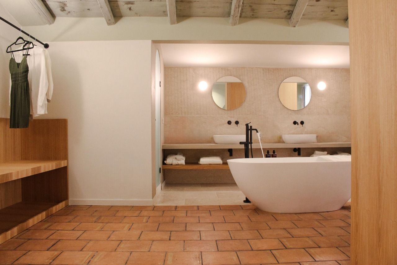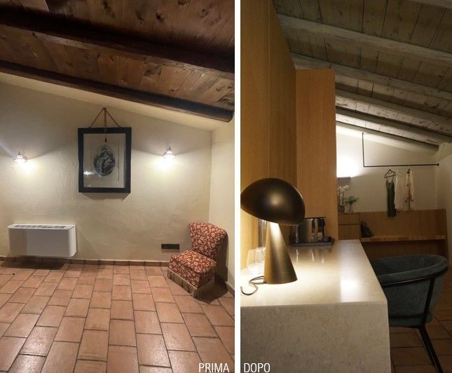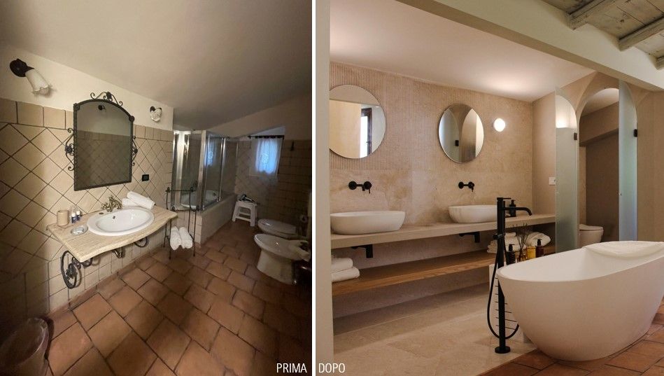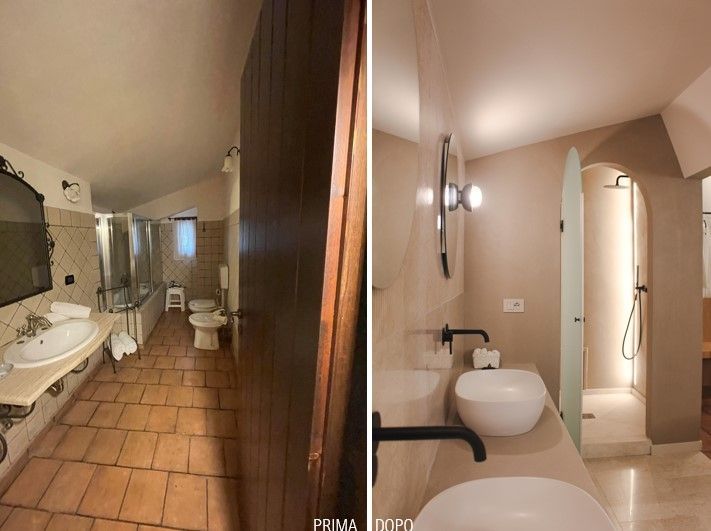 Il progetto ha profondamente modificato l'impostazione planimetrica e l'immagine della vecchia camera della quale è stata mantenuta unicamente la pavimentazione in cotto. La scelta principale è stata quella di realizzare un grande bagno in suite rivestito in marmo perlatino siciliano. Il grande piano per i lavabi separa gli ambienti destinati alla cabina igienica da un lato e la doccia con bagno turco dall'altro.