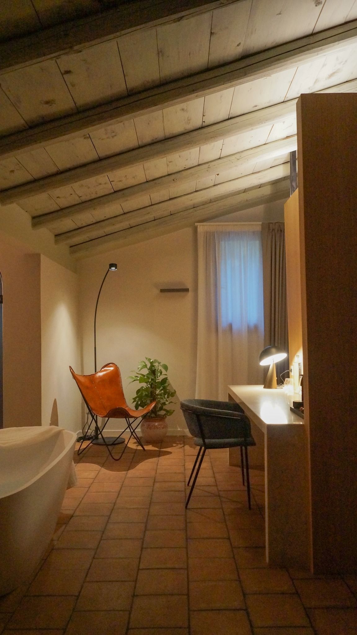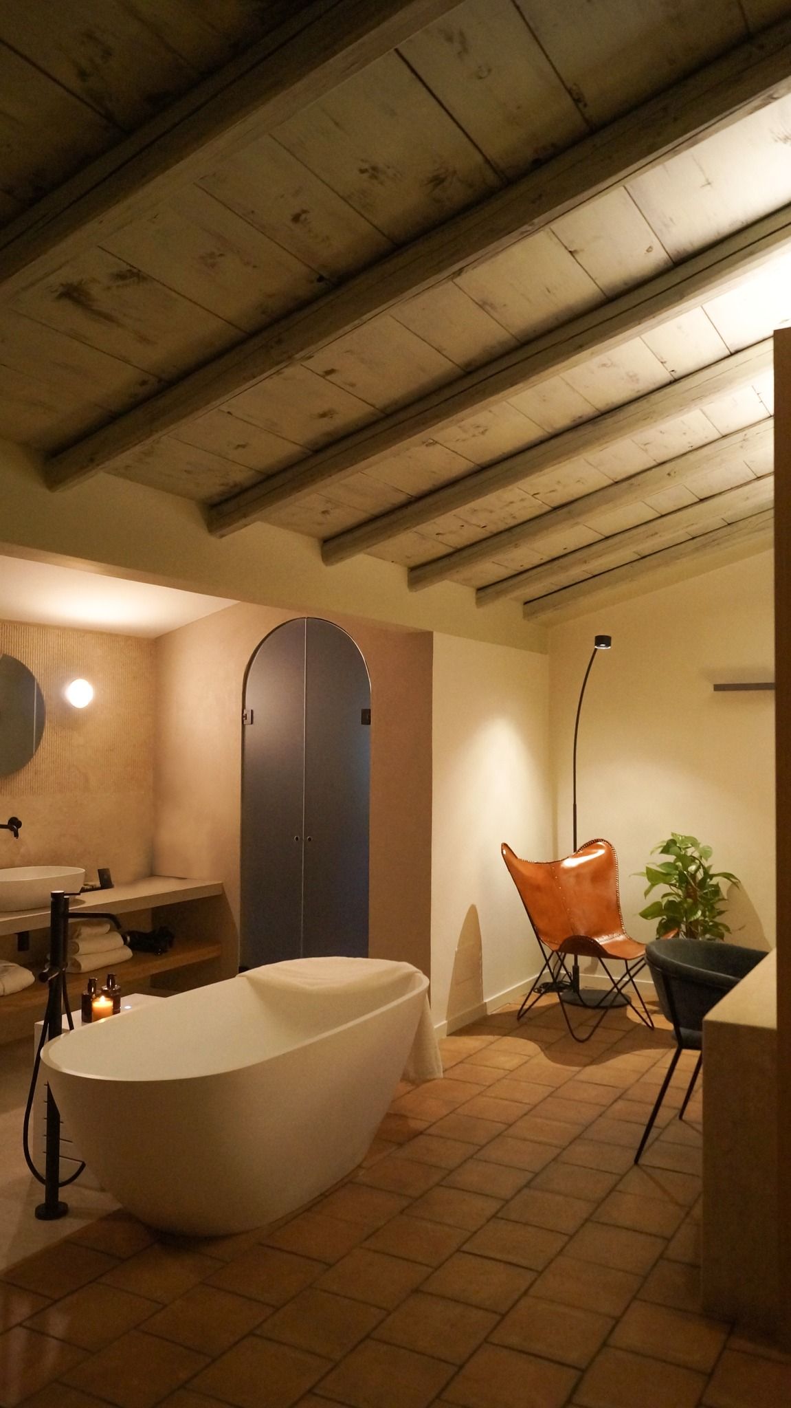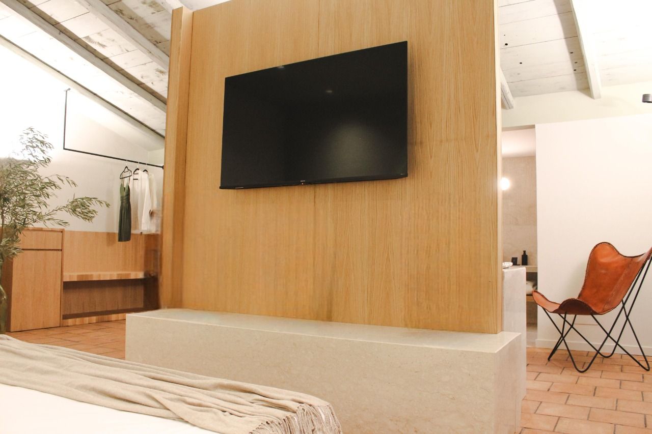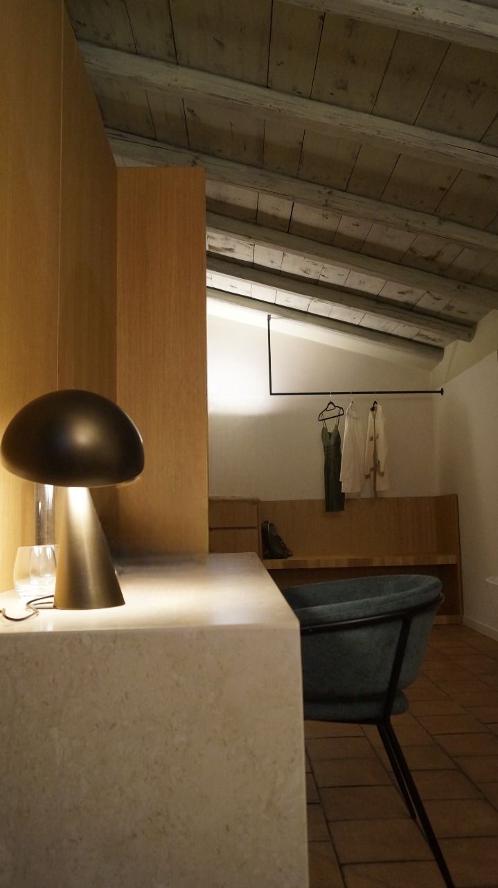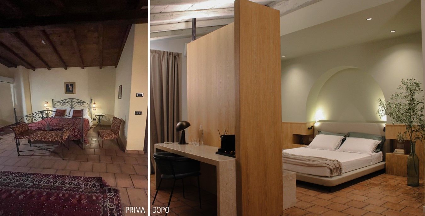 Una vasca idromassaggio da libera installazione separa la zona bagno dal resto della camera pensata come un grande open space separato da un setto che conferisce privacy alla zona letto. Quest'ultima è caratterizzata da un arco che accoglie il capezzale del letto definendo uno spazio che rimanda alle alcove. In legno di rovere è stata pensata la boiserie che ingloba i comodini e il portavaligie. Nello stesso materiale è stato realizzato il setto che divide gli ambienti della suite il cui basamento in marmo perlatino ospita dal lato del letto un piano di appoggio e dalla parte opposta uno scrittoio.