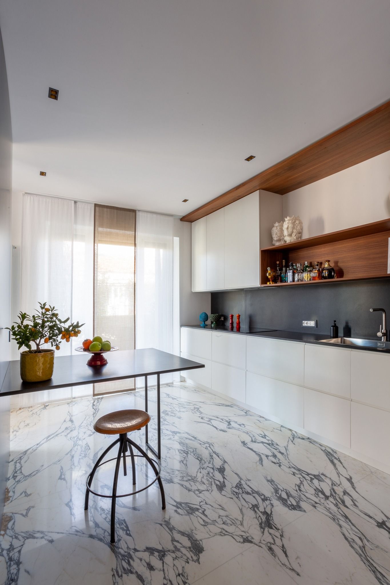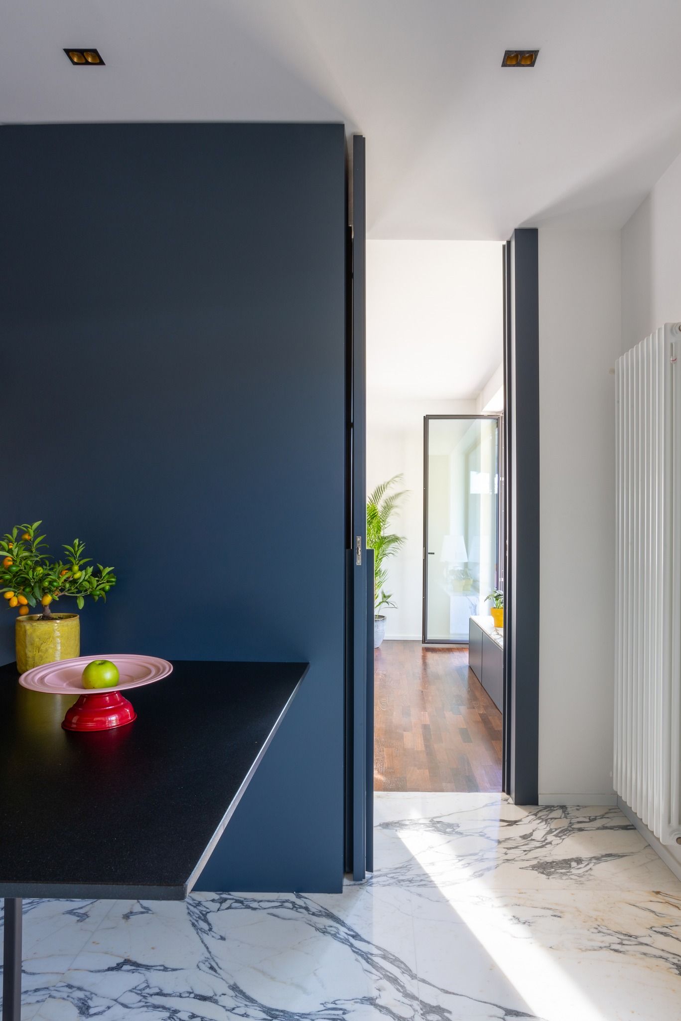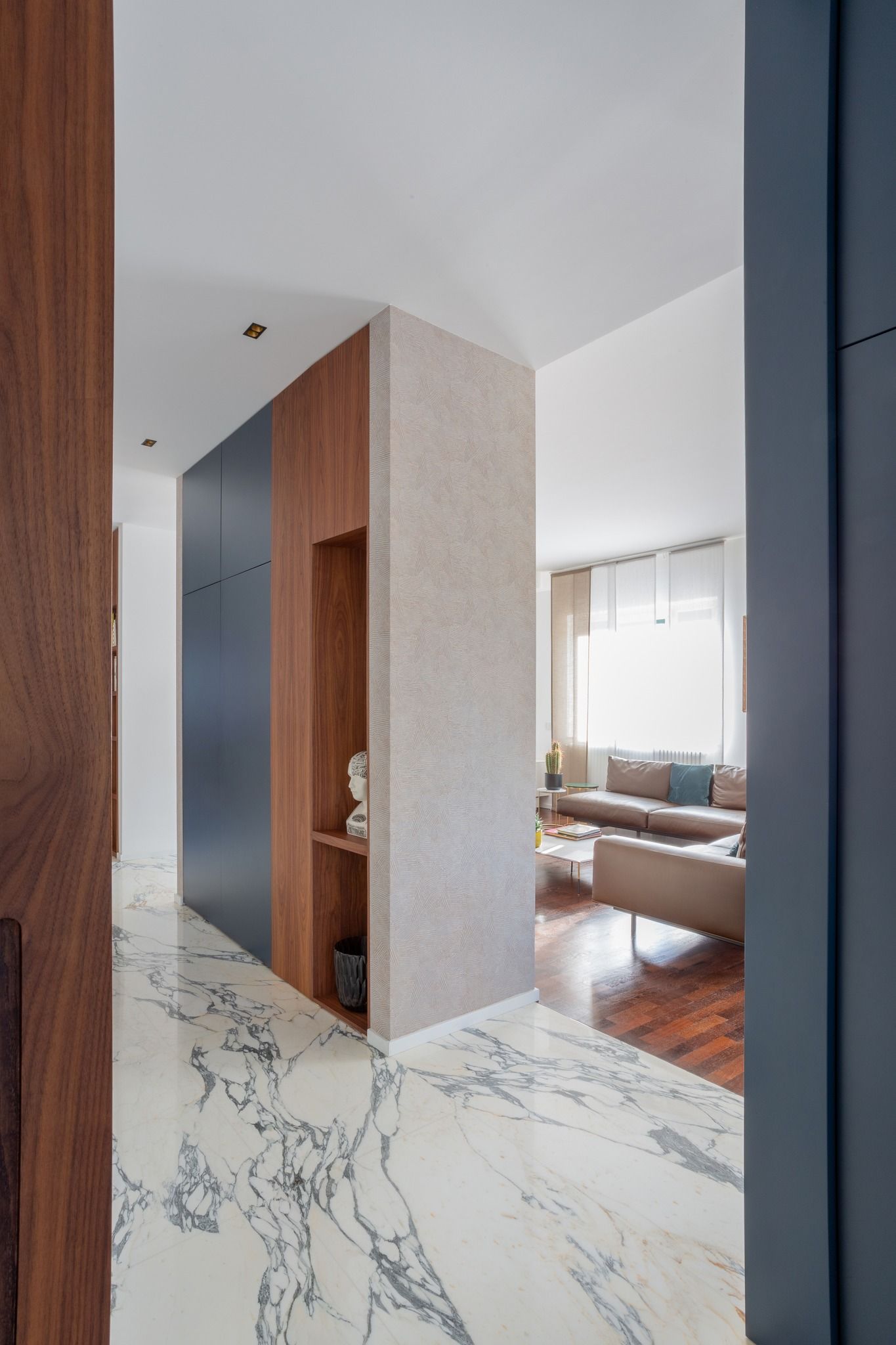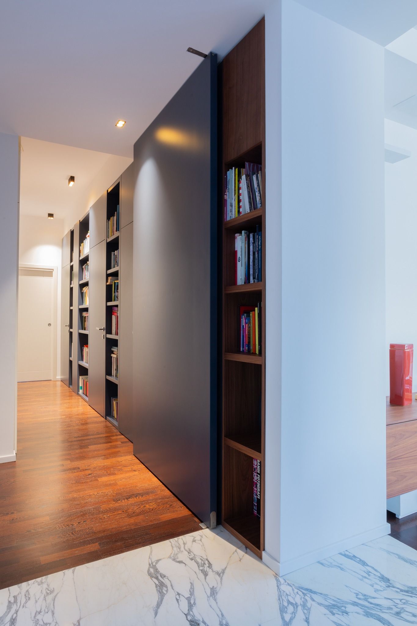 In questo tratto le porte di accesso alle camere da letto sono state collegate da una lunga libreria. A terra si è mantenuto in parte un parquet originale integrandolo nella zona ingresso/cucina con un pavimento in lastre di Calacatta a macchia aperta. Tutti gli arredi fissi sono stati progettati su misura.