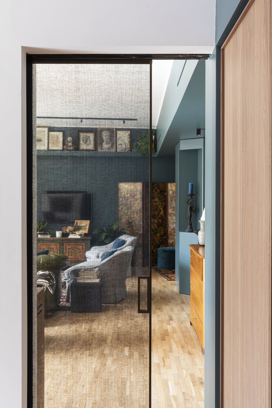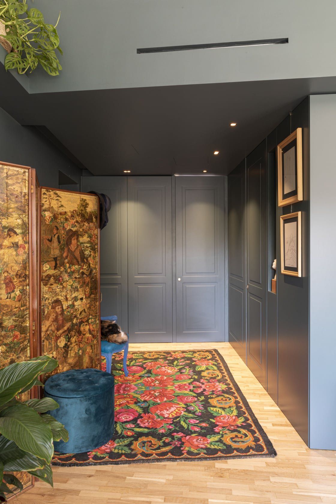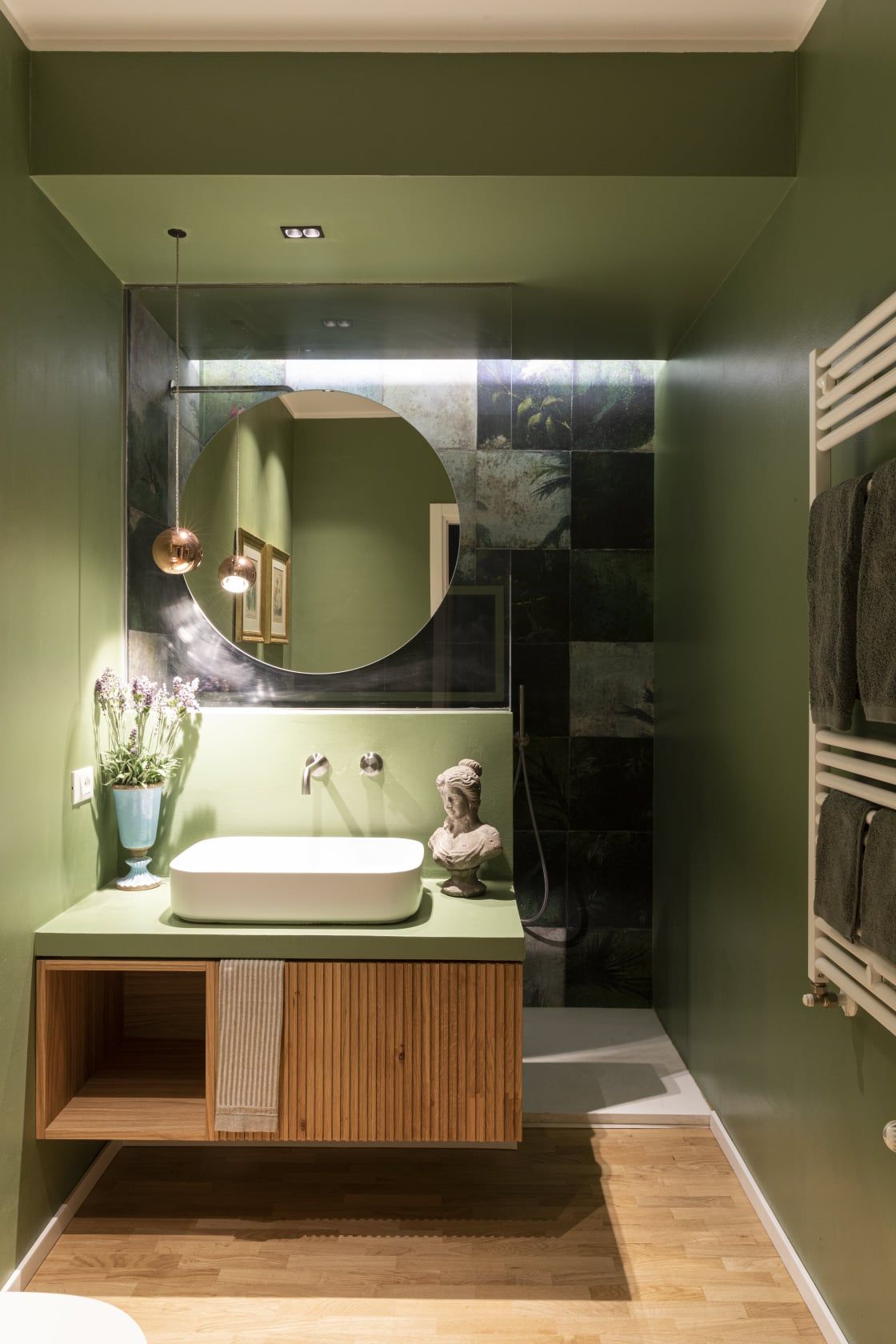 Il verde ottanio è stato scelto per colorare le pareti e i mobili fissi caratterizzando fortemente l’immagine della casa. Tramite un disimpegno la casa collega i suoi spazi pubblici a quelli privati della zona notte e ai servizi igienici caratterizzati dall’uso di carte da parati e resine a parete. Il pavimento di parquet a piccola doga disposta a spina italiana si estende su tutta la casa creando continuità ad un paesaggio domestico altrimenti sempre diverso. La terrazza, come accennato è stata pensata come un ambiente di vita quotidiano, valorizzato da un progetto di verde lussureggiante in grado di schermare dalla vista del contesto urbano. La terrazza è presidiata da una pergola in acciaio corten ombreggiata come vuole tradizione mediterranea da un cannucciato. I veri proprietari di casa sono i tre gatti che presidiano questo piccolo mondo così denso con aristocratico distacco.
