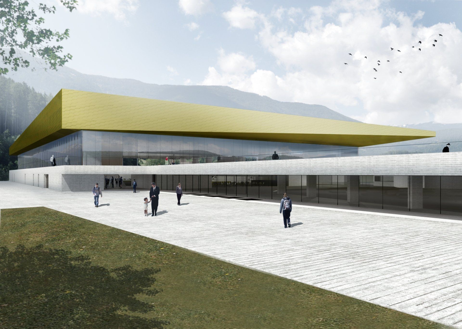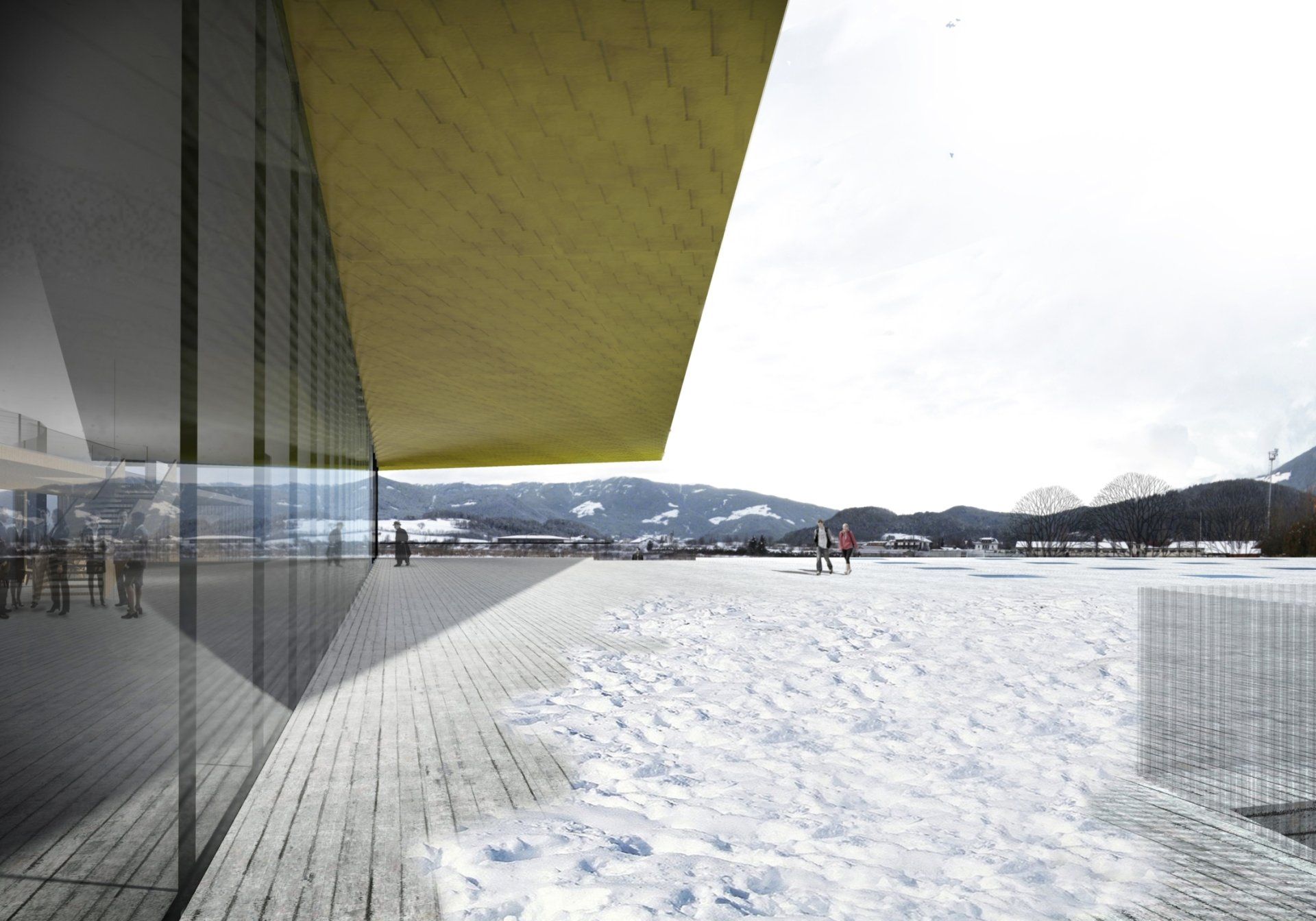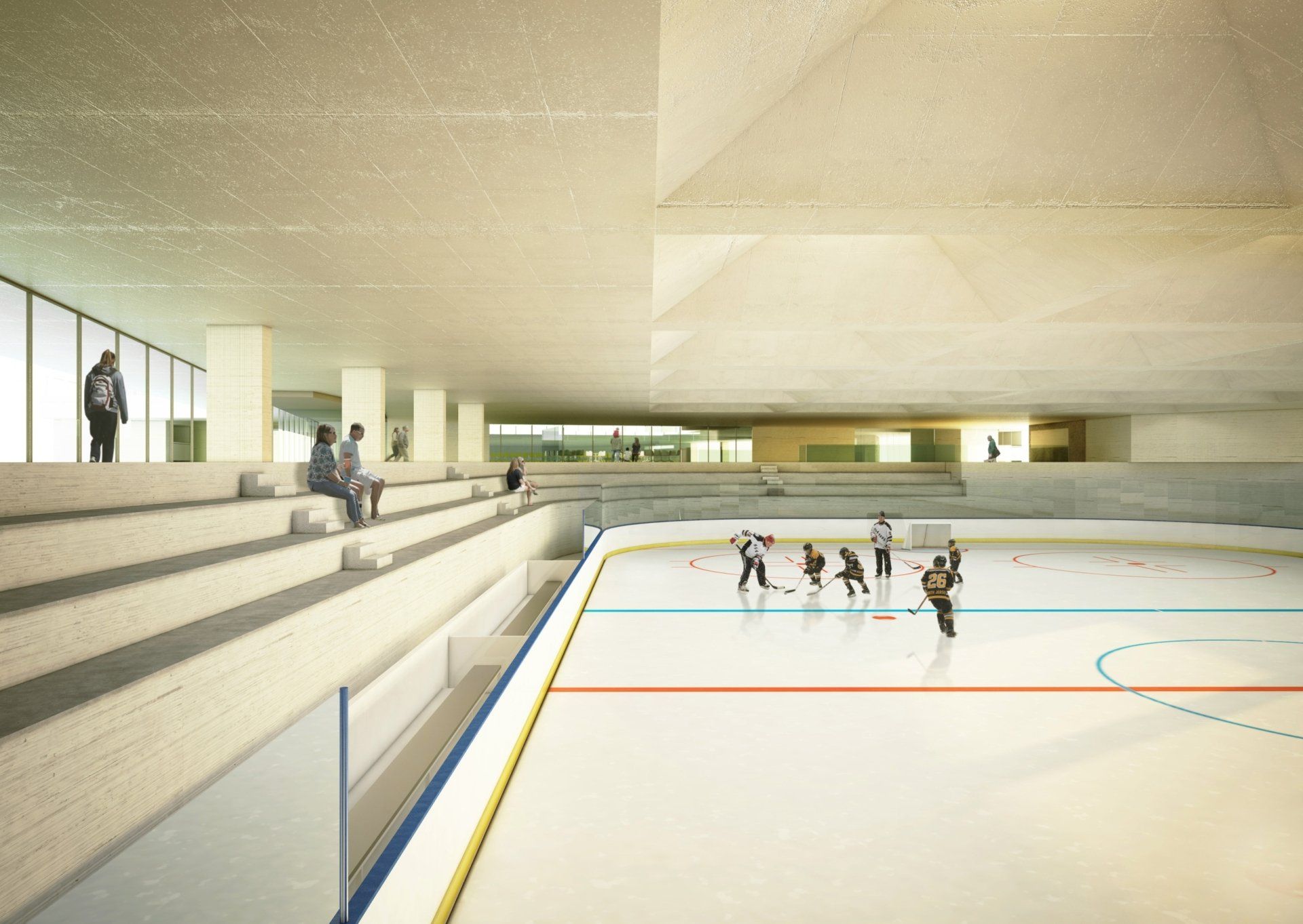 In collaborazione con Suàrez & Santas Arquitectos La strategia di progetto prevede un unico edificio integrato nel suo contesto naturale e cosciente della sua ubicazione al margine della città. Volumetricamente l’edificio è scomponibile in due elementi: il plateau che si configura come una grande piazza e che contiene i campi da ghiaccio e il grande tetto che vuole determinarsi come un oggetto astratto, galleggiante sopra il plateau che copre il campo e le tribune principali dell’arena