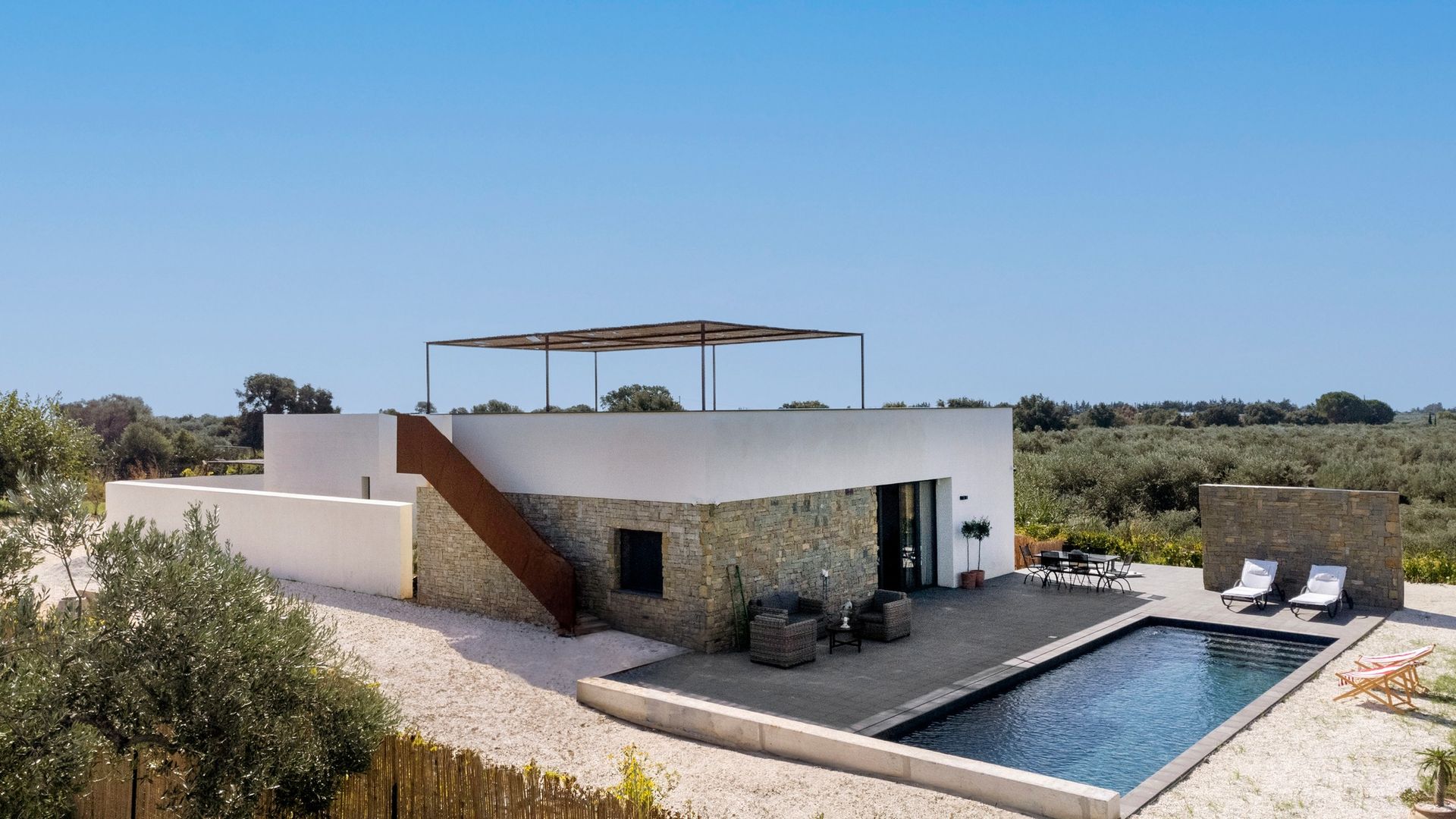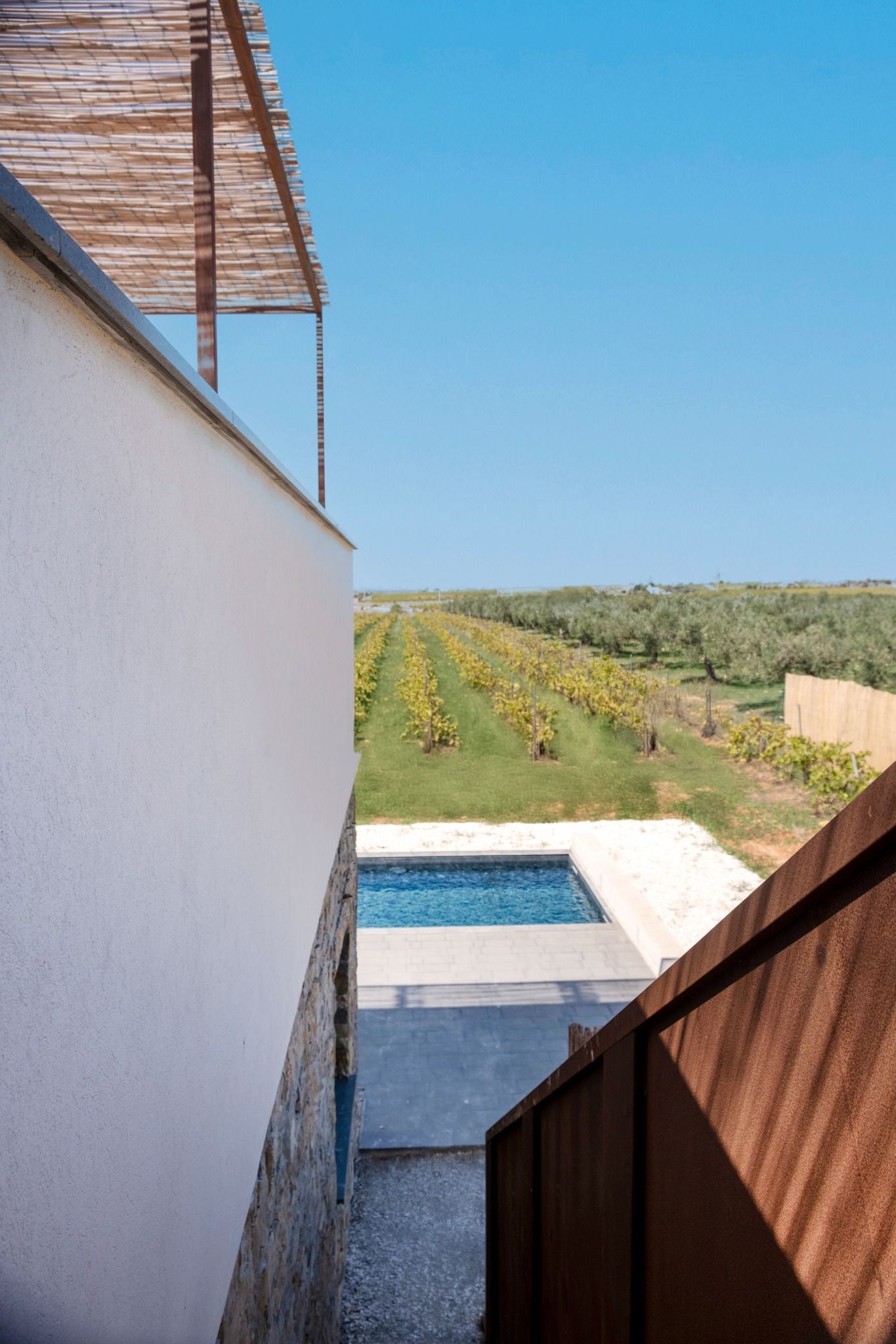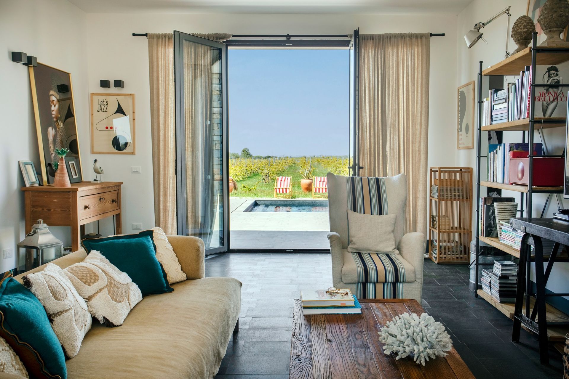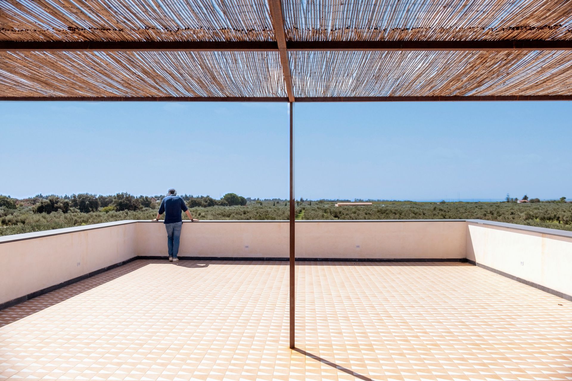 Il soggiorno dialoga, tramite grandi aperture con l'esterno, da un lato con il cortile e dall'altro con il paesaggio caratterizzato da un vigneto. A mediare la vista delle vigne è stata posizionata una piscina il cui fondo scuro aiuta ad intonare l'acqua al colore del cielo. Una scala metallica collega il piano di campagna ad un terrazzo che domina la campagna del territorio di Menfi e dal quale si riesce a scrutare, all'orizzonte, il mare.