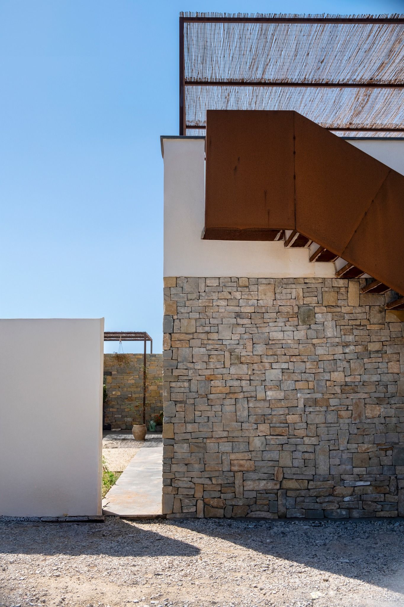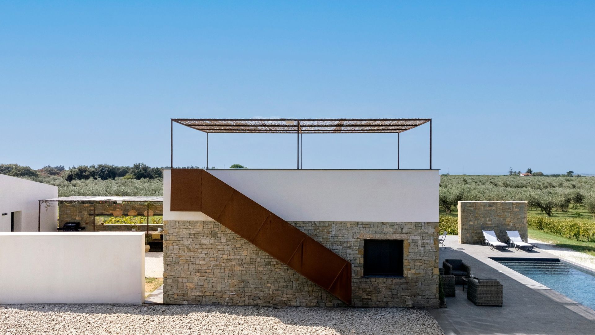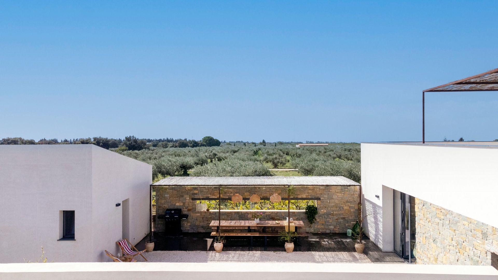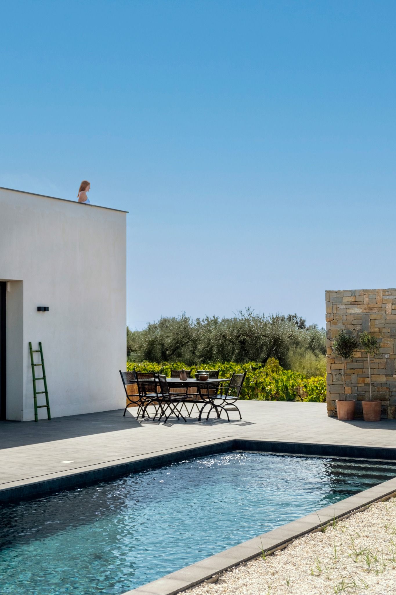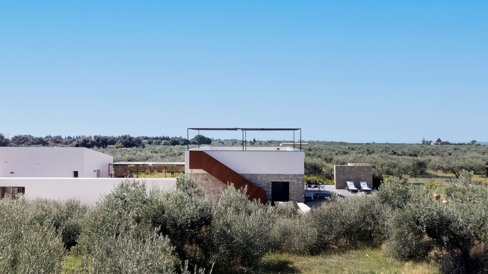 Il soggiorno dialoga, tramite grandi aperture con l'esterno, da un lato con il cortile e dall'altro con il paesaggio caratterizzato da un vigneto. A mediare la vista delle vigne è stata posizionata una piscina il cui fondo scuro aiuta ad intonare l'acqua al colore del cielo. Una scala metallica collega il piano di campagna ad un terrazzo che domina la campagna del territorio di Menfi e dal quale si riesce a scrutare, all'orizzonte, il mare.