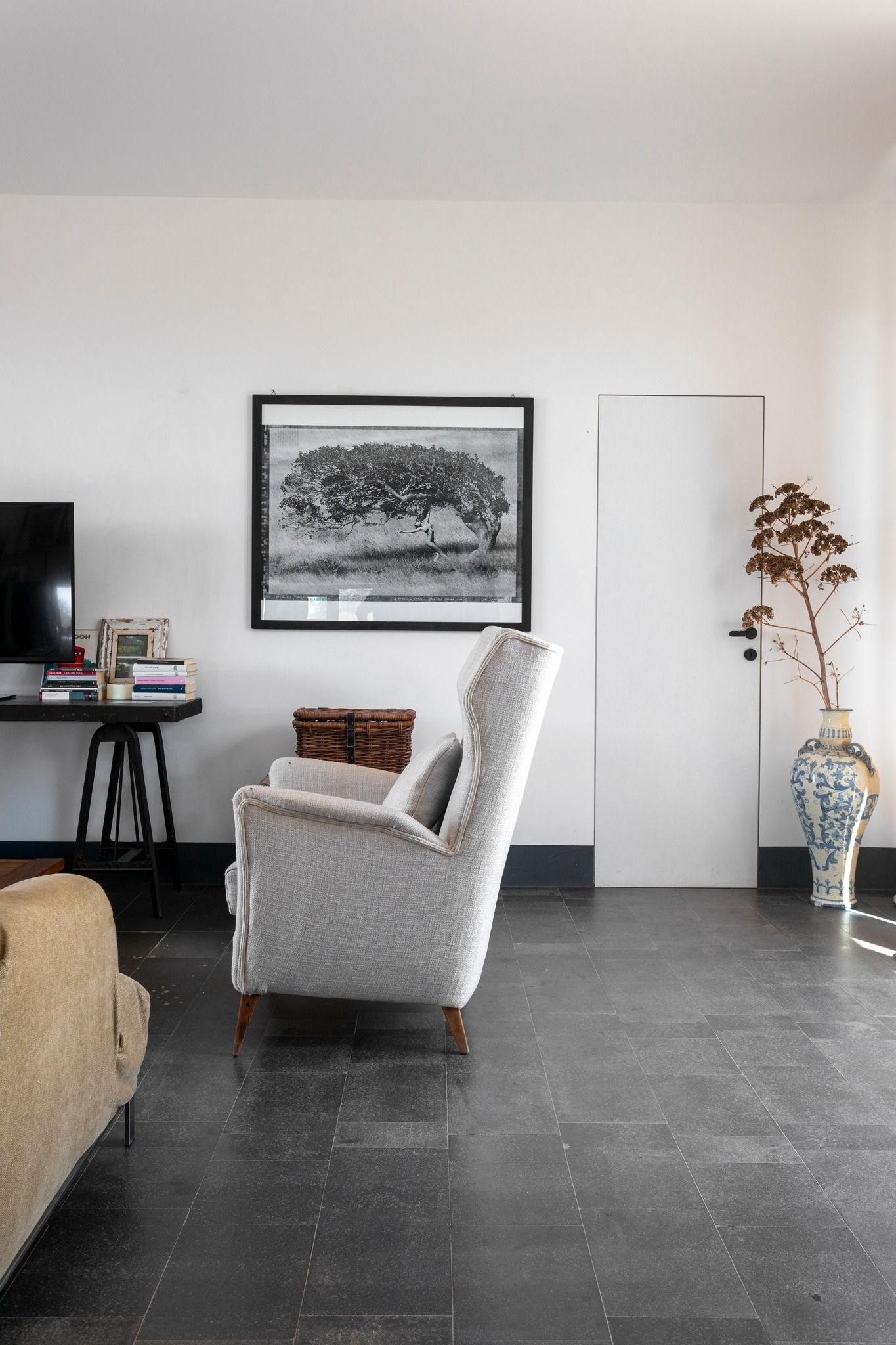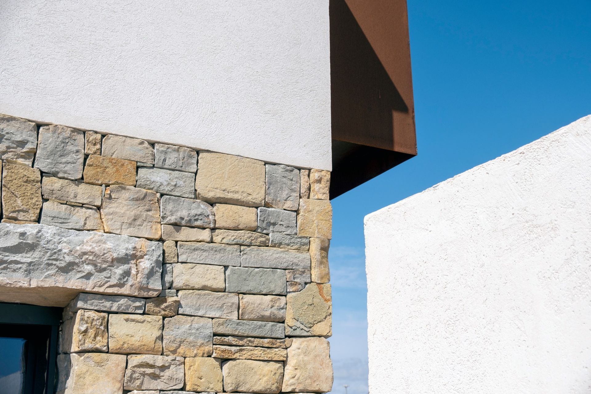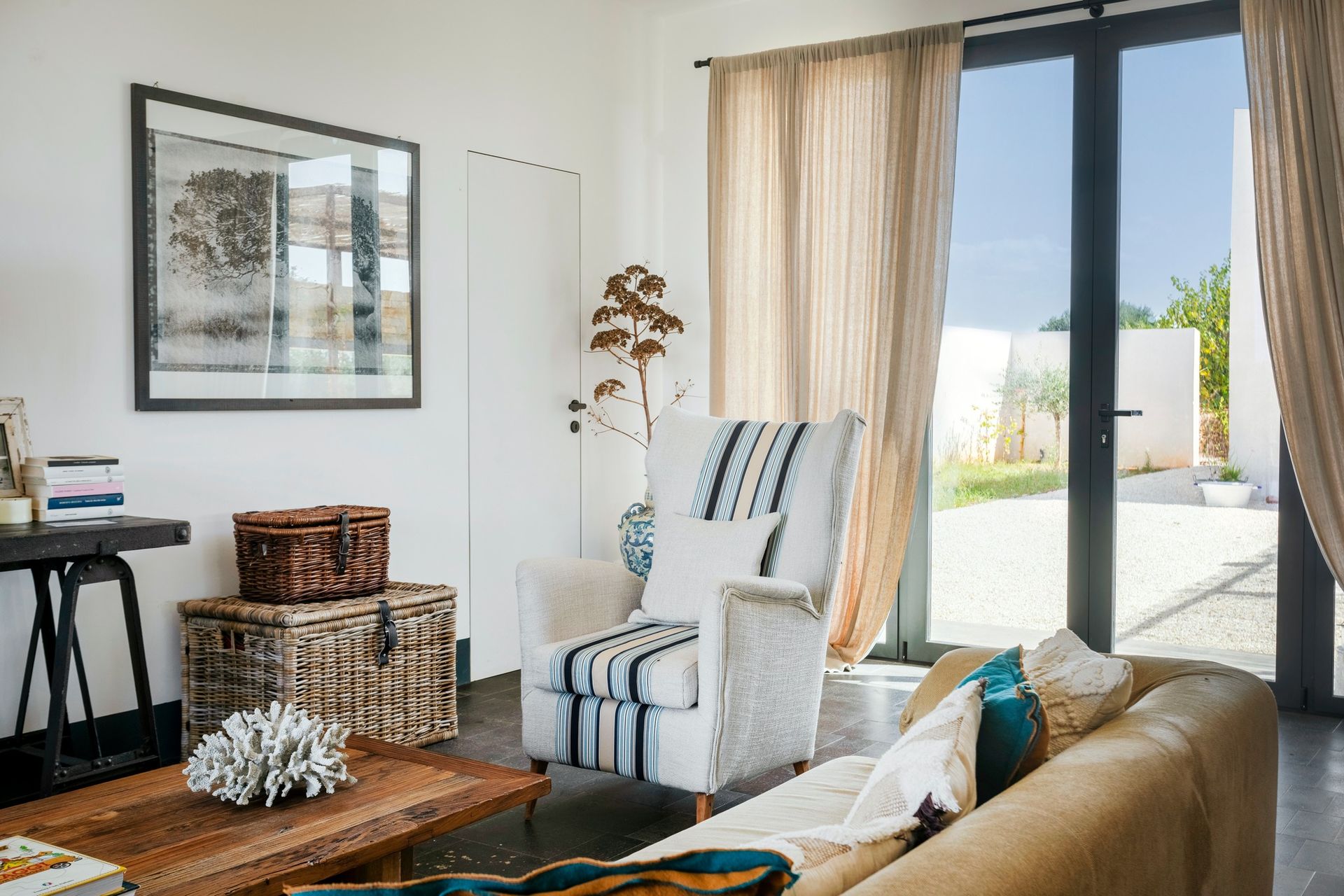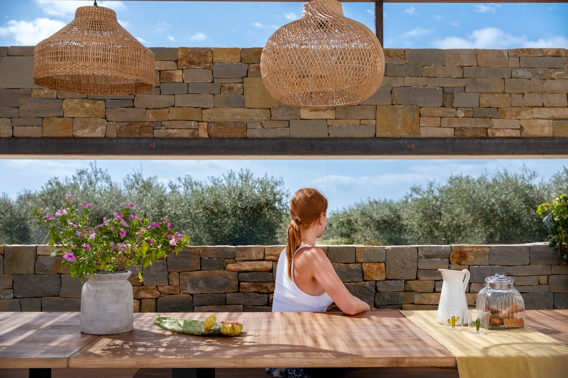 Il soggiorno dialoga, tramite grandi aperture con l'esterno, da un lato con il cortile e dall'altro con il paesaggio caratterizzato da un vigneto. A mediare la vista delle vigne è stata posizionata una piscina il cui fondo scuro aiuta ad intonare l'acqua al colore del cielo. Una scala metallica collega il piano di campagna ad un terrazzo che domina la campagna del territorio di Menfi e dal quale si riesce a scrutare, all'orizzonte, il mare.