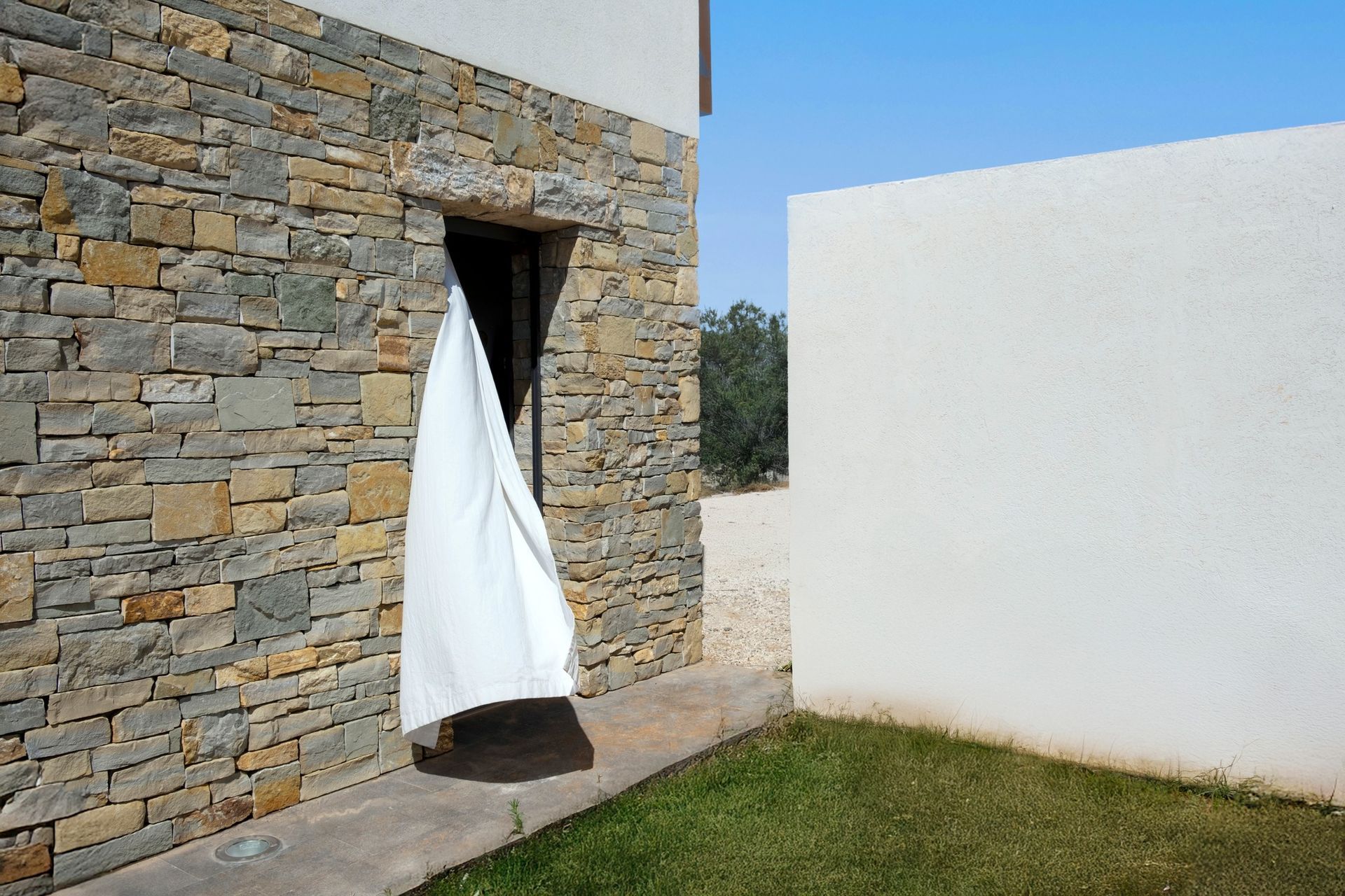 Questi due volumi definiscono, insieme a due muri, questo spazio che è anche la 'stanza' più grande della casa. Da un lato del cortile il muro si apre tramite una finestra a nastro che ritaglia il paesaggio