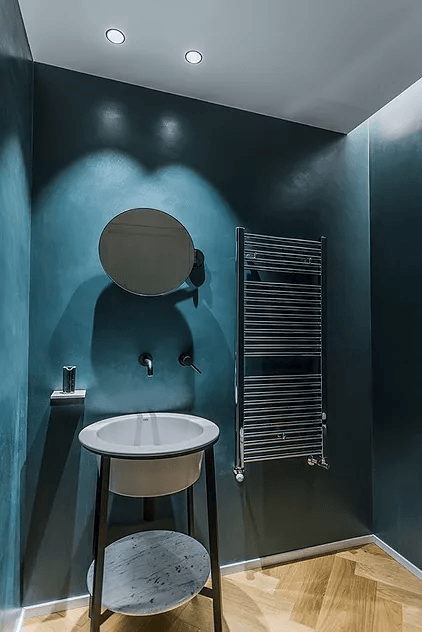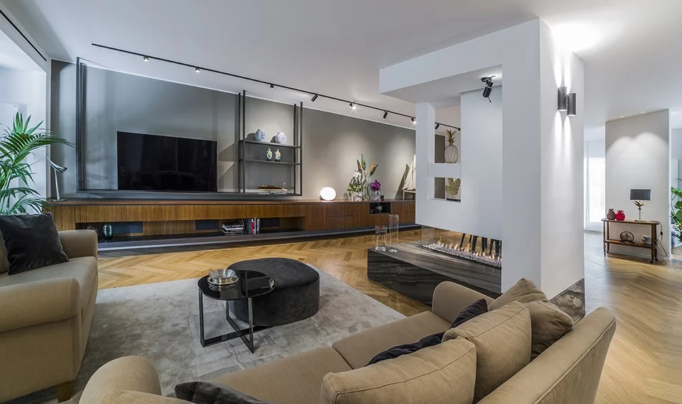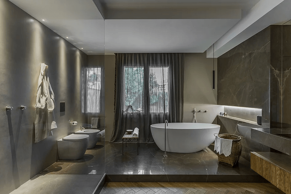 Al centro del soggiorno un grande camino e una panca in marmo separa la zona conversazione dal pranzo. La sala da bagno è interamente rivestita in marmo e ospita una vasca da libera installazione.