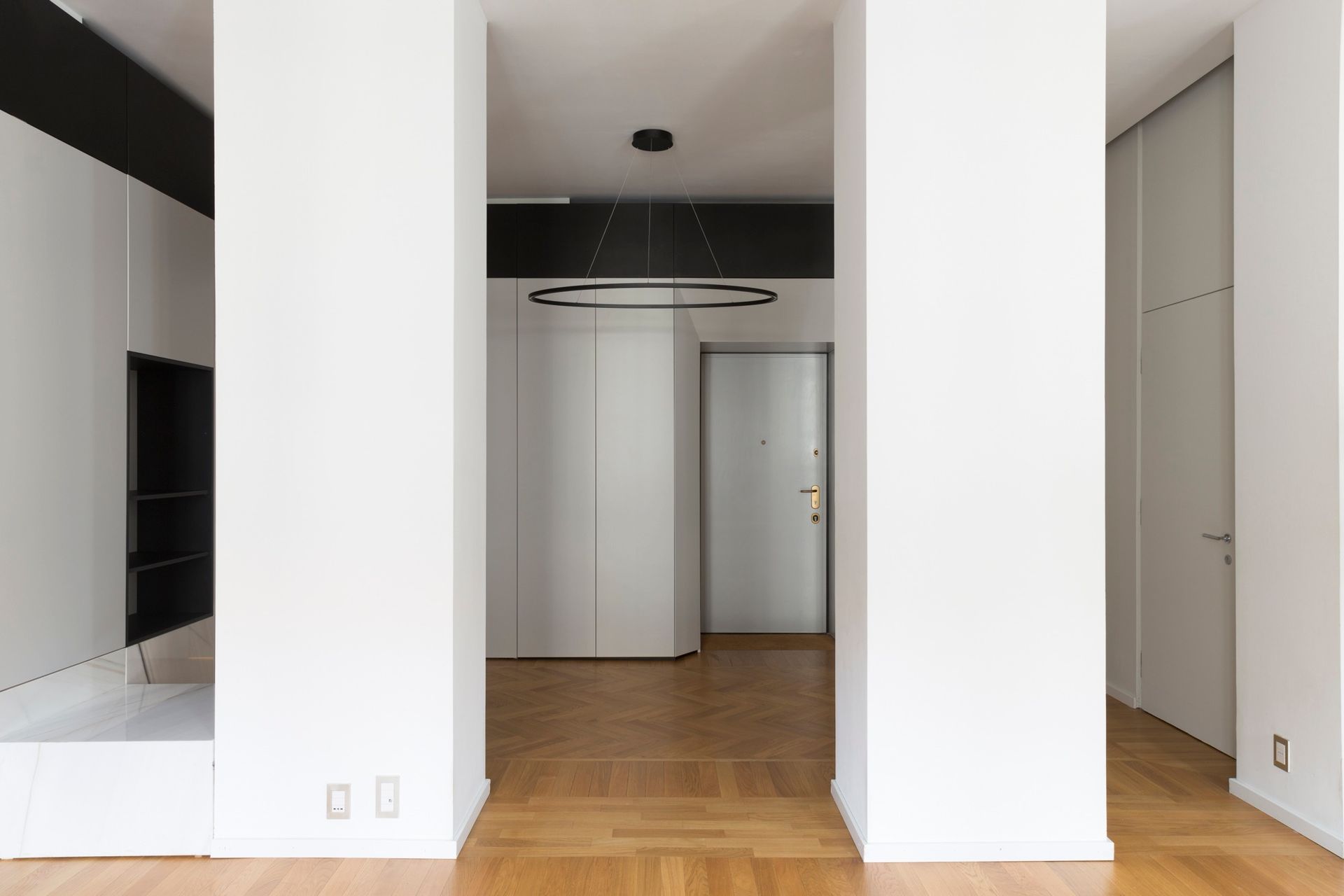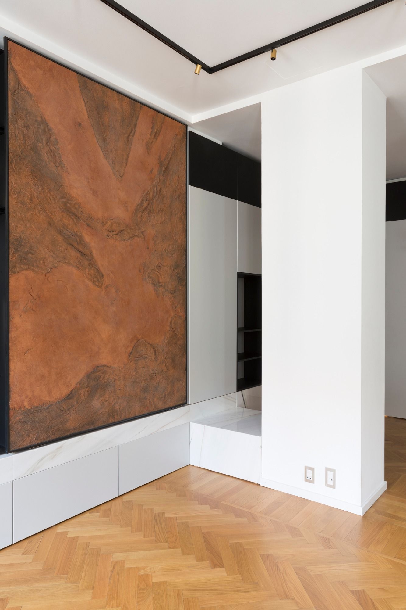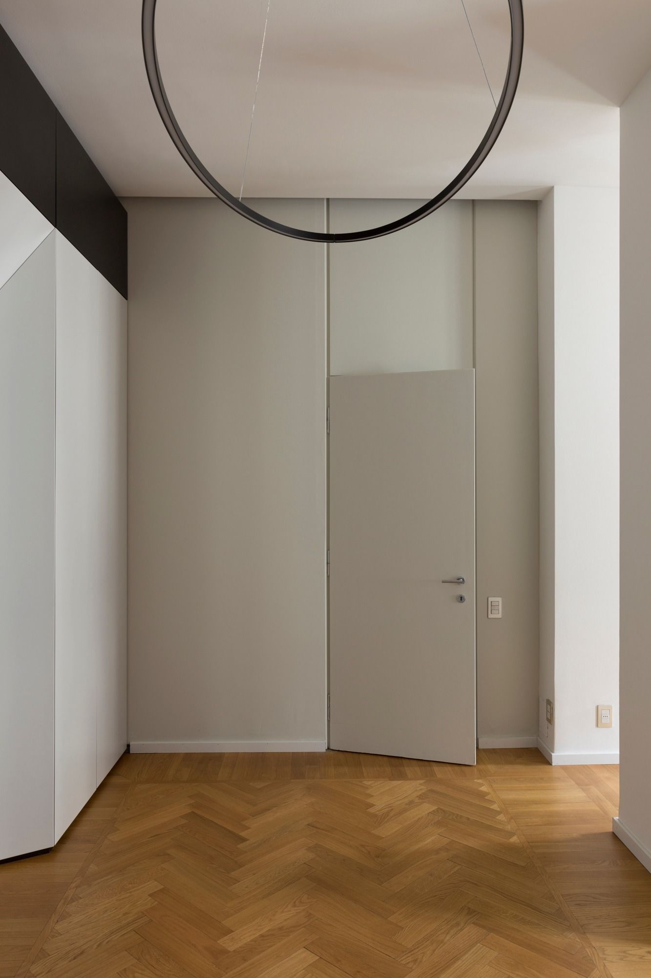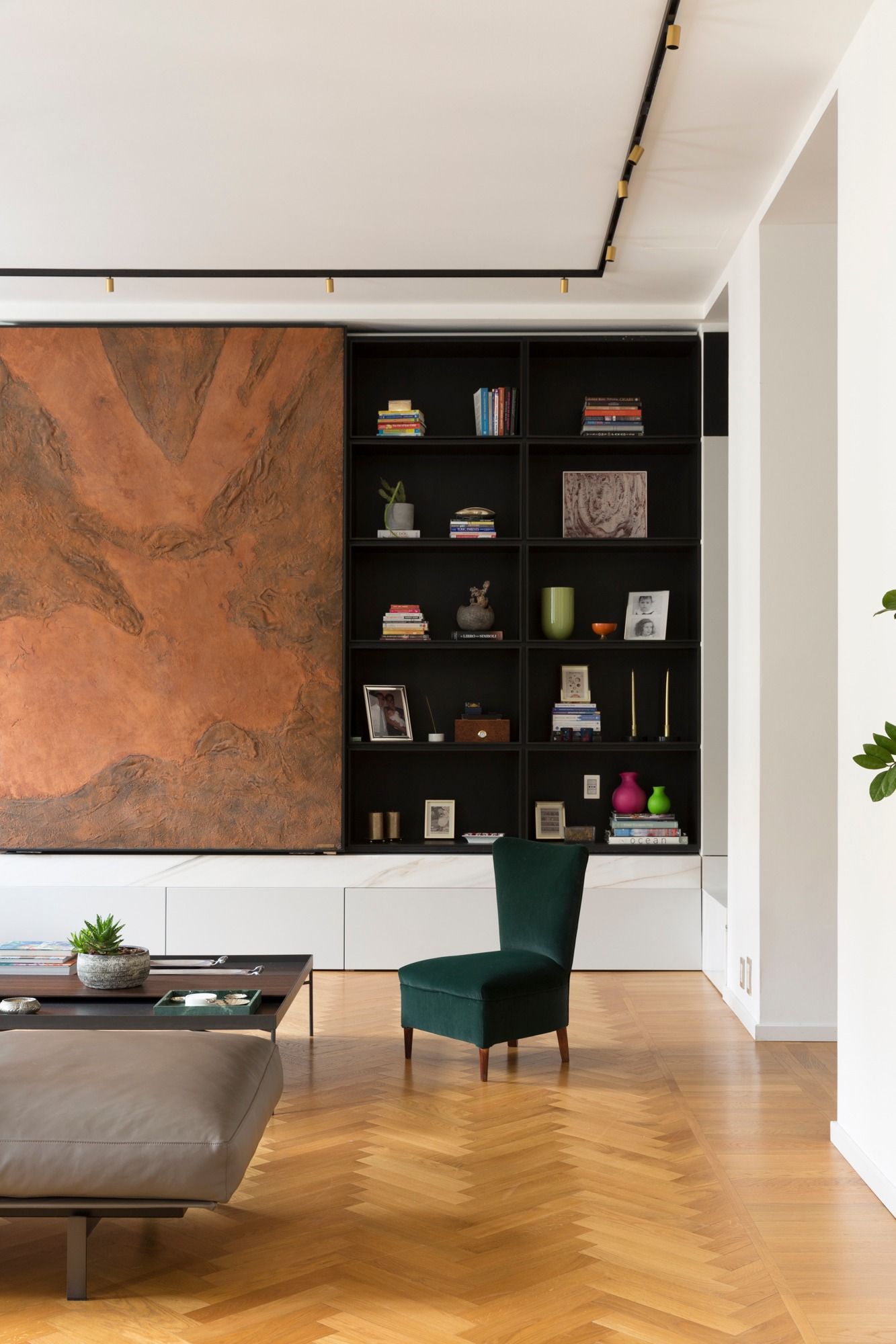 Un grande divano in pelle di LEMA, presidia la zona conversazione che fronteggia la grande libreria. Questa è caratterizzata come accennato dal pannello decorativo che grazie ad un sistema di pattini e binari scorre lungo lo sviluppo della libreria svelando all’occorrenza la TV. La libreria poggia su una base in Marmo Bianco Lasa in contrasto con il grigio e il nero scelti per la libreria. Fulcro della casa è il grande ingresso che funge da dispositivo di collegamento con il resto della casa: Il soggiorno- cucina; la zona letto delle figlie e dalla parte opposta la suite matrimoniale. Nell’ingresso una grande boiserie nasconde guardaroba e armadi. La stessa cura artigianale è stata perseguita nei bagni dove è stato scelto come rivestimento la pietra di Brera oltre a resine e parati decorativi.