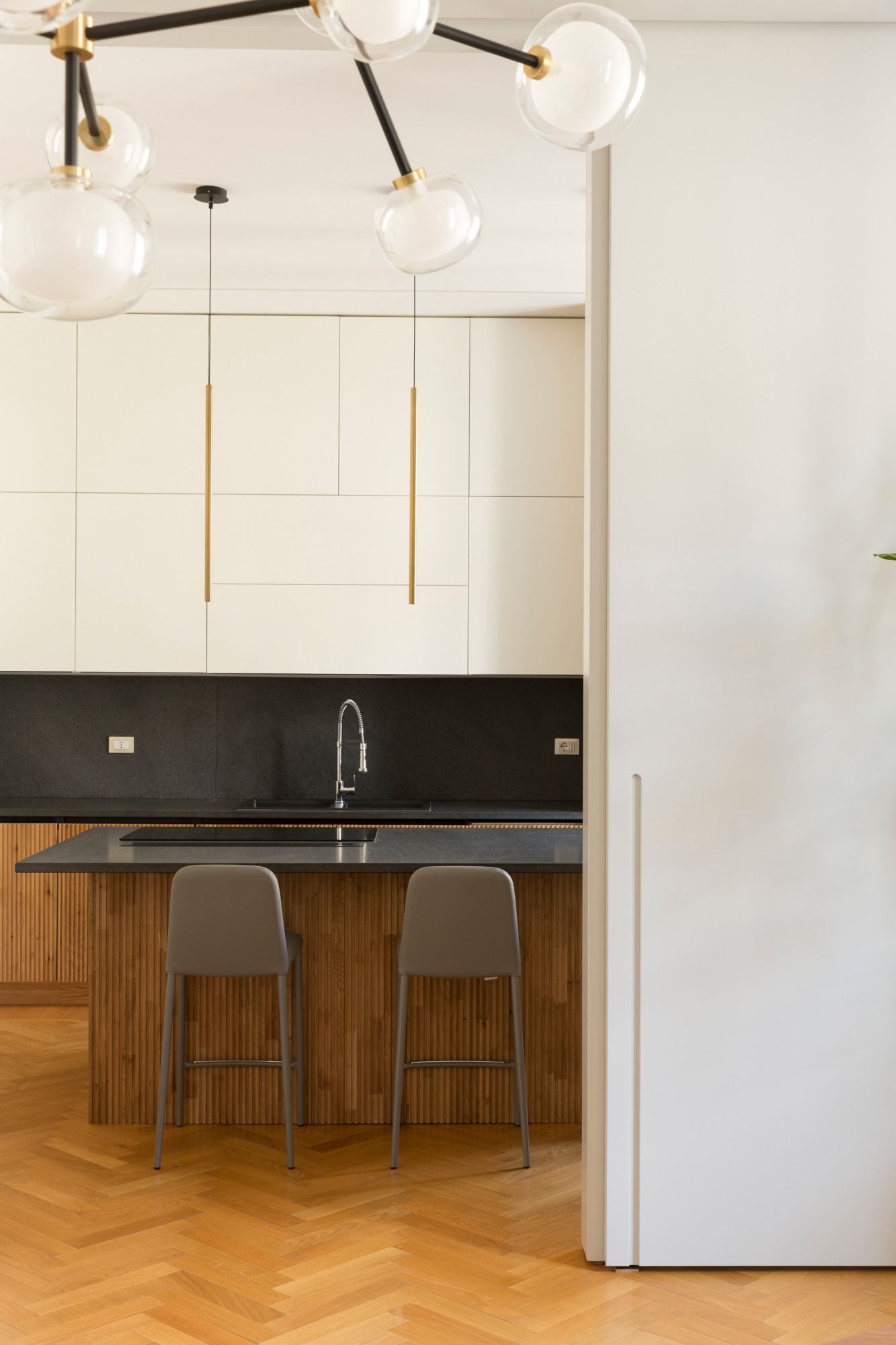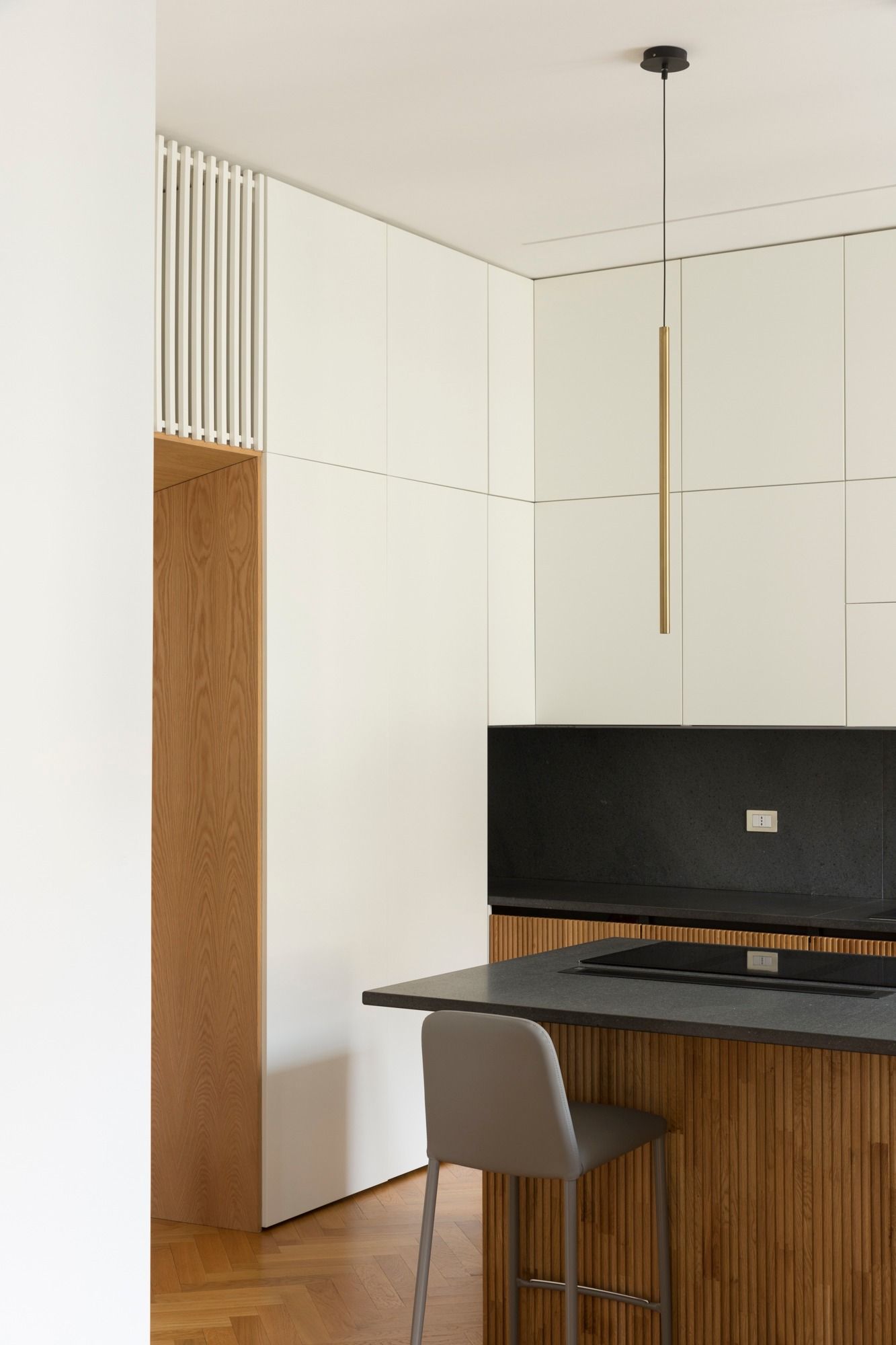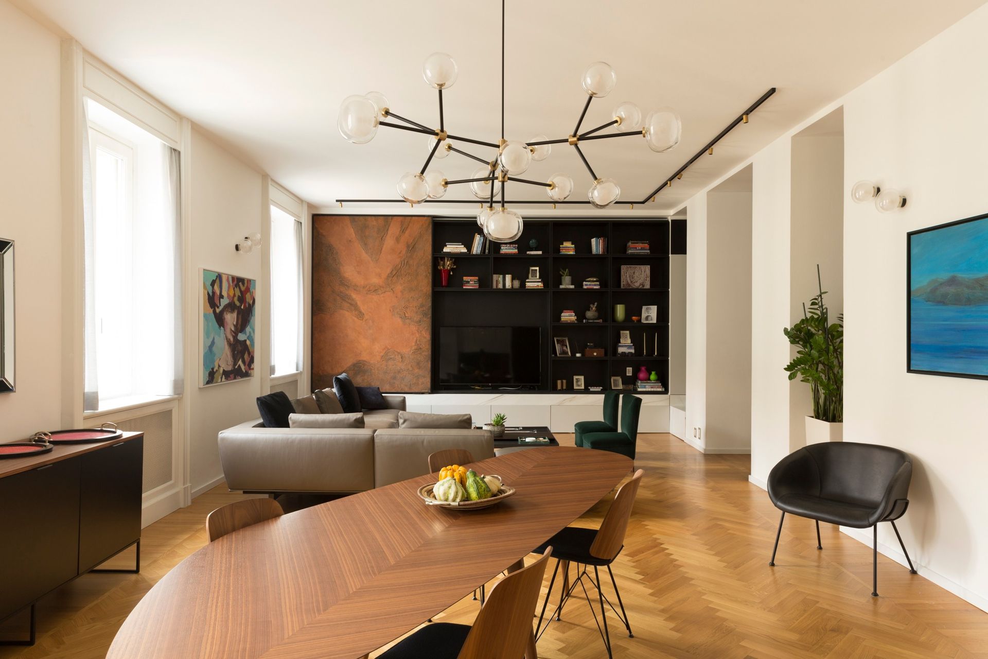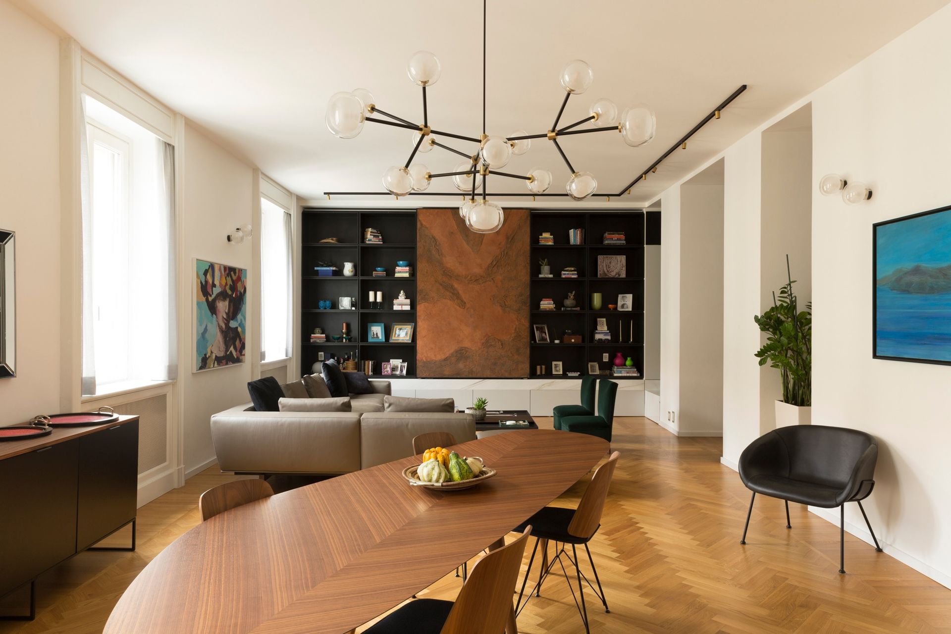 A dispetto della sua collocazione geografica questo appartamento ha forte radici palermitane, a partire dal proprietario che ha voluto progettista, maestranze e fornitori palermitani, un modo forse per avvicinarsi ancora di più a casa. Tutti i mobili su misura sono stati realizzati da falegnamerie palermitane così come siciliani sono i fabbri, i tappezzieri e i fornitori dei marmi e anche dei mobili, una condizione che fa di questo appartamento, anche grazie alla squisita ospitalità dei proprietari, una piccola ambasciata palermitana a milano.Il progetto dei mobili su misura ha coinvolto anche la cucina dove una ampia isola in pietra lavica del’Etna presidia il centro della stanza. Il resto della cucina è in legno laccato bianco con inserti in rovere. Nell’appartamento esisteva un parquet originario inchiodato come in uso nelle case milanesi dell’epoca che è stato mantenuto e implementato negli ambienti che ne erano originariamente sprovvisti. La cucina posta in continuità con il soggiorno è da questa separabile grazie ad una ampia porta scorrevole, anch’essa realizzata su misura a Palermo. Il resto del soggiorno è caratterizzato da un ampio tavolo da pranzo (tweed di Zanotta) posto in posizione trasversale per consentire la massima fruizione visiva di Santa Maria delle Grazie dalla parte opposta alla parete finestrata un camino anch’esso rivestito in pietra lavica.