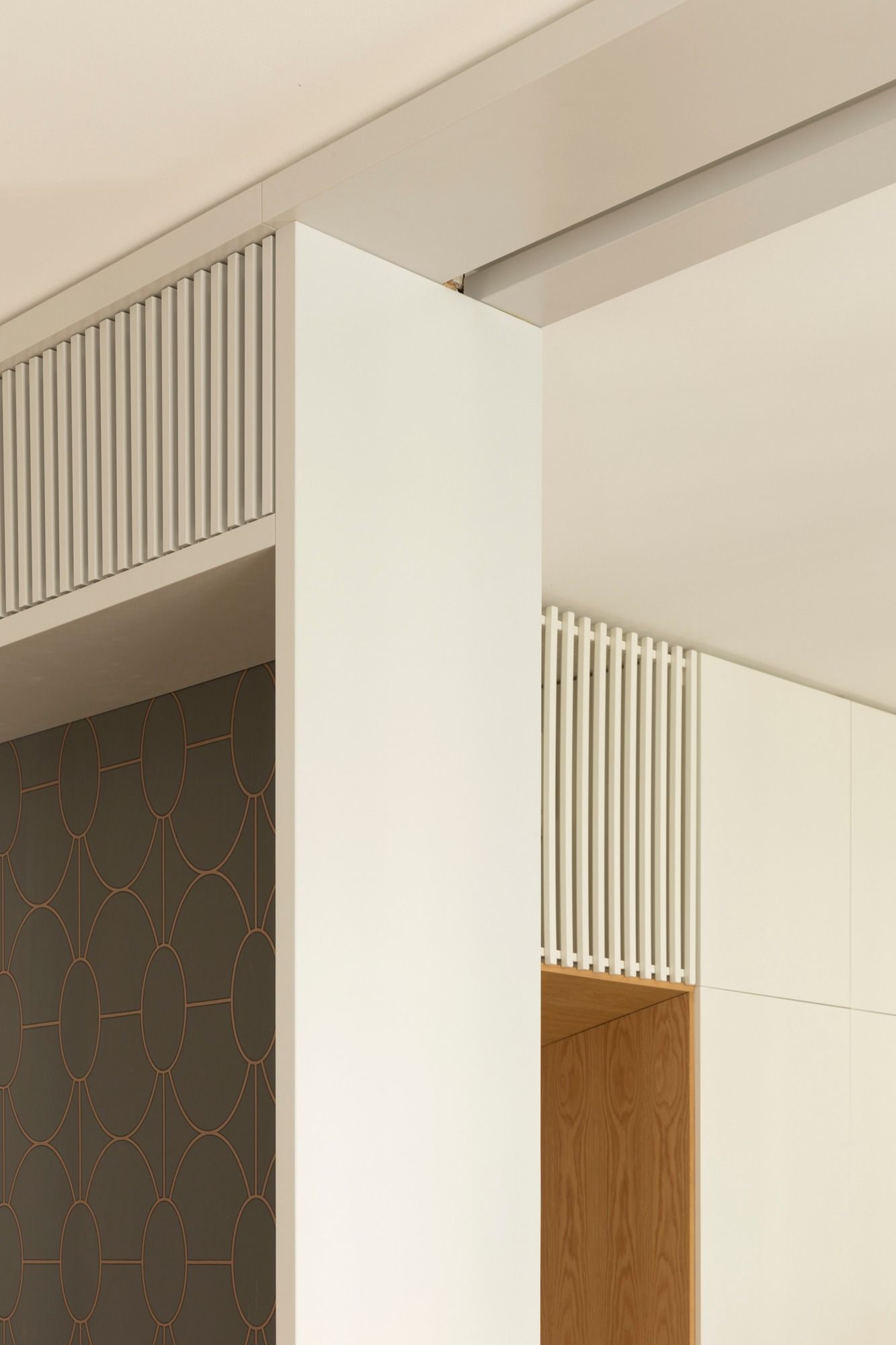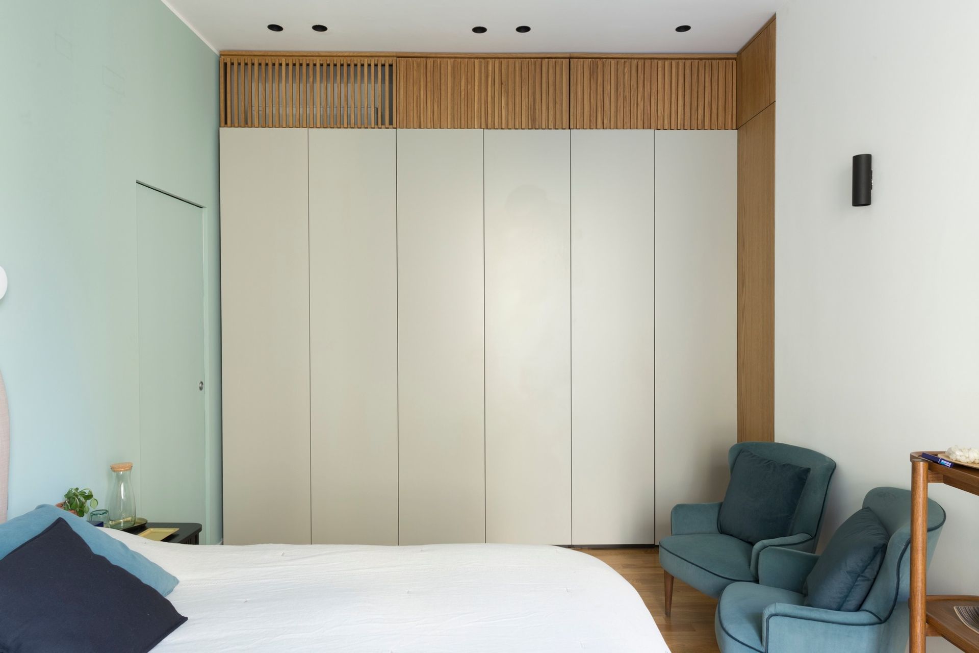 L’appartamento si trova in un edificio dei primi del ‘900 in stile umbertino. Un edificio austero ed elegante tipicamente milanese dotato di un cortile luminoso e verde. L’appartamento occupa per intero il secondo piano e gode di una esposizione particolarmente favorevole che consente di avere un'ottima illuminazione naturale durante tutte le ore del giorno. La luce è stata la prima ragione che ha fatto innamorare i proprietari comprensibilmente stanchi dei grigiori londinesi. L’appartamento è stato rimodulato nella distribuzione interna posizionando una grande cucina in continuità con il soggiorno e riposizionando le camere da letto e i servizi igienici. Dalle finestre del soggiorno si apprezza la facciata della Basilica di Santa Maria delle Grazie che custodisce all’interno il celebre affresco di Leonardo dell’Ultima Cena. La facciata della basilica in mattoni rossi ha ispirato la cromia di uno degli elementi maggiormente iconici dell’appartamento rappresentato da un pannello decorativo, un’opera unica, scelta dai progettisti come quinta e sfondo prospettico del soggiorno.