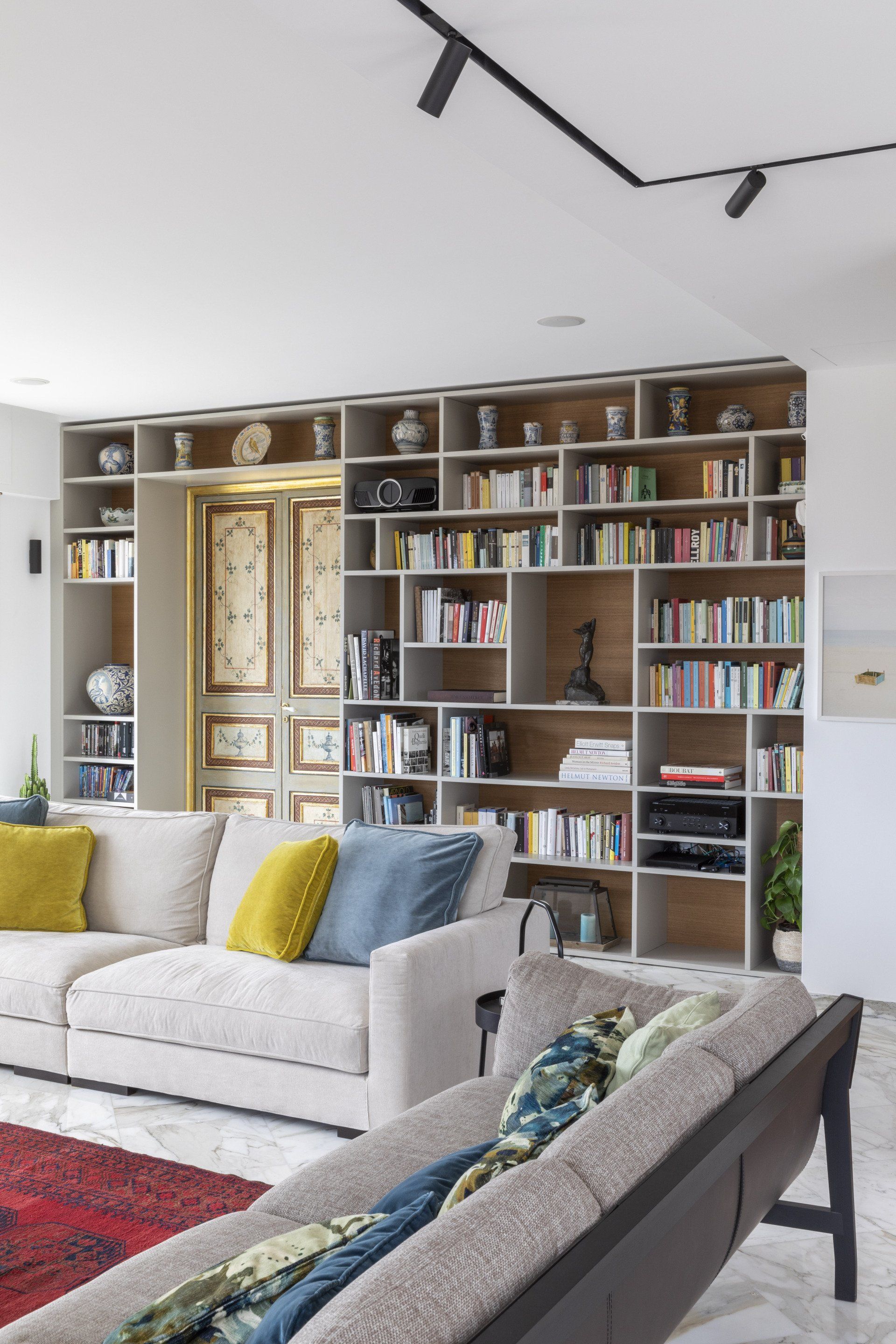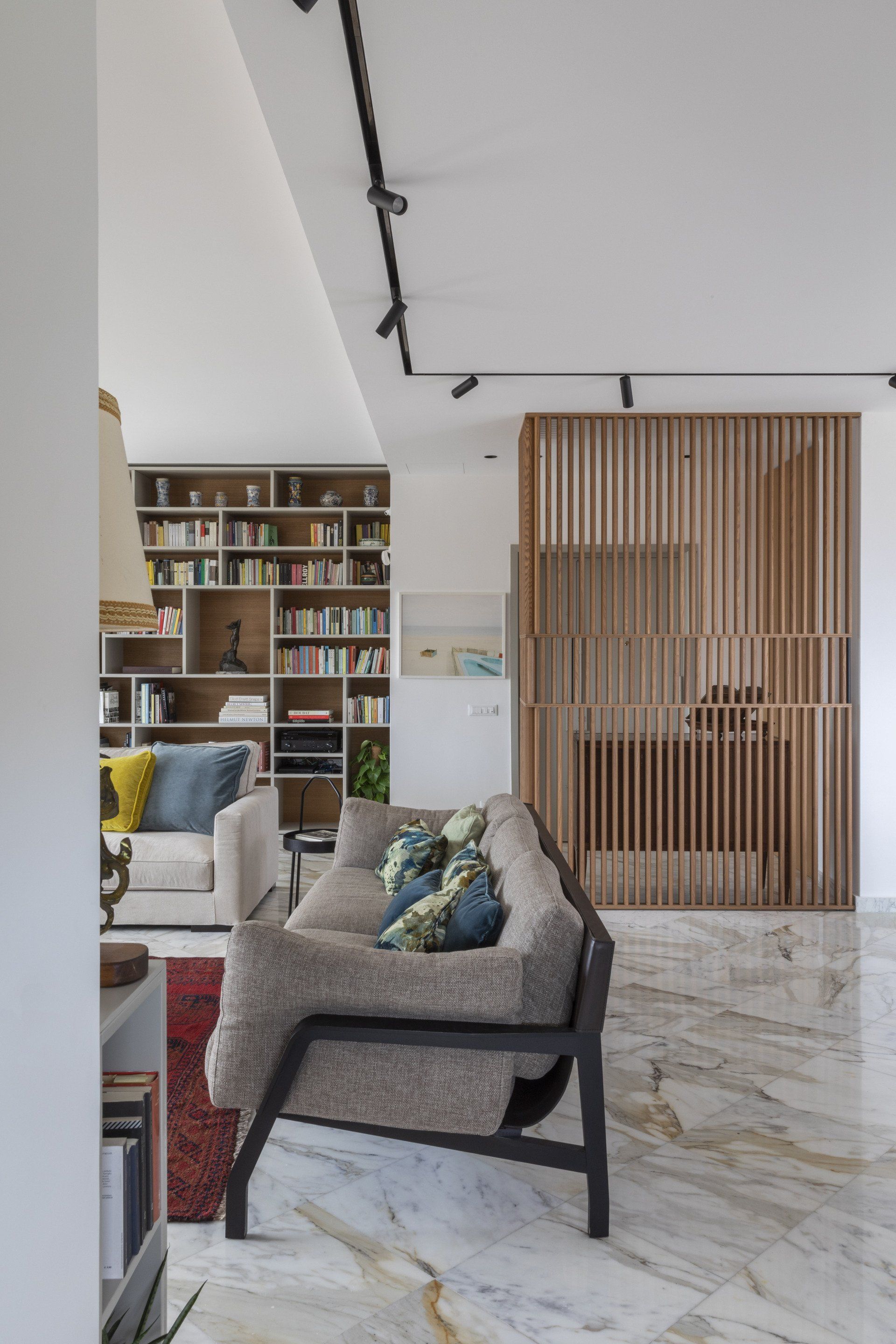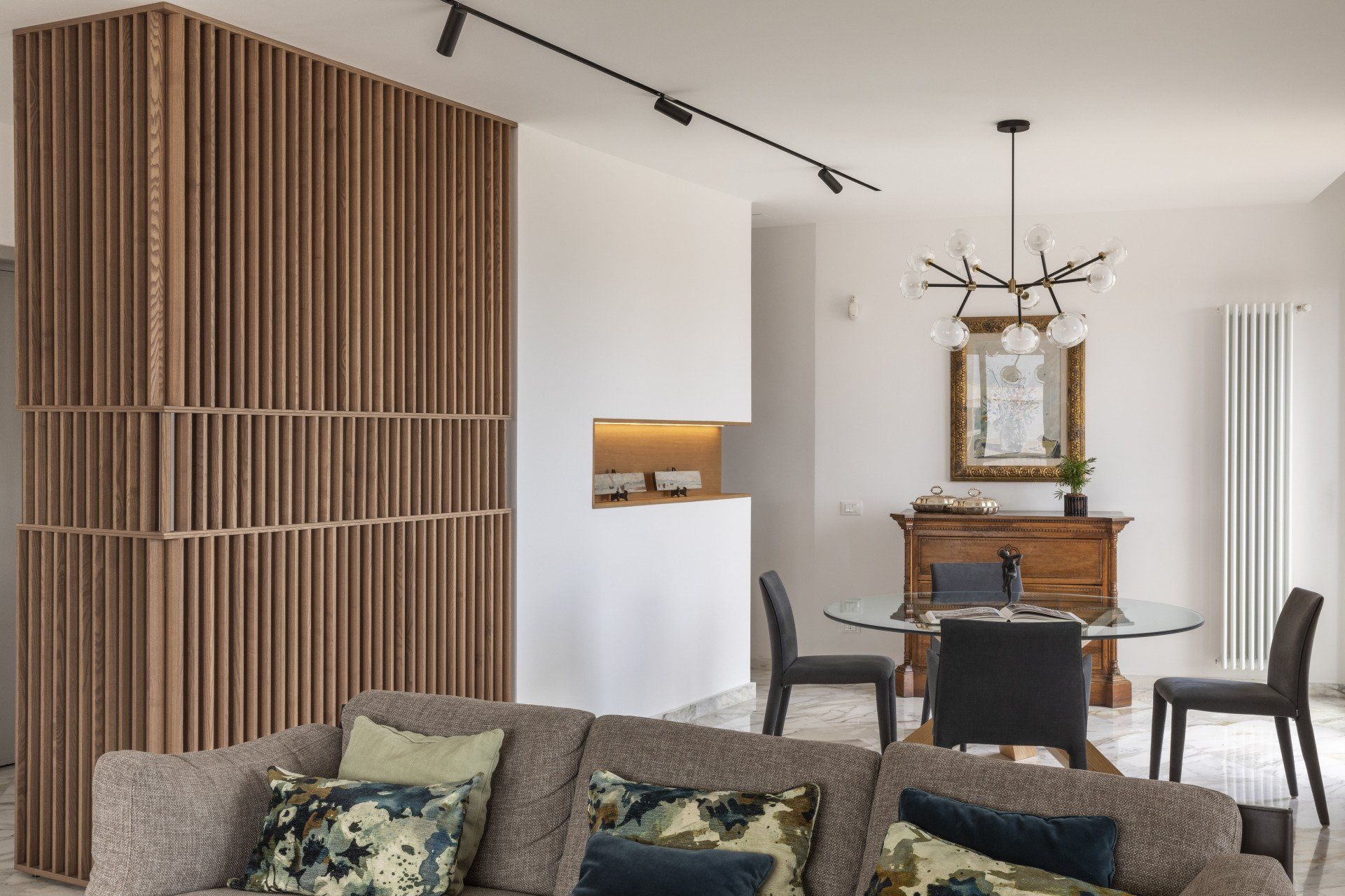 La sagoma irregolare della pianta ha suggerito soluzioni che rendessero abitabili spazi di solito privi di funzione come corridoi e disimpegni. Il grande soggiorno è caratterizzato da una gelosia in legno che scherma la porta di accesso e dai mobili della zona living, realizzati su misura: una grande libreria ed un mobile che inquadra il camino a gas.