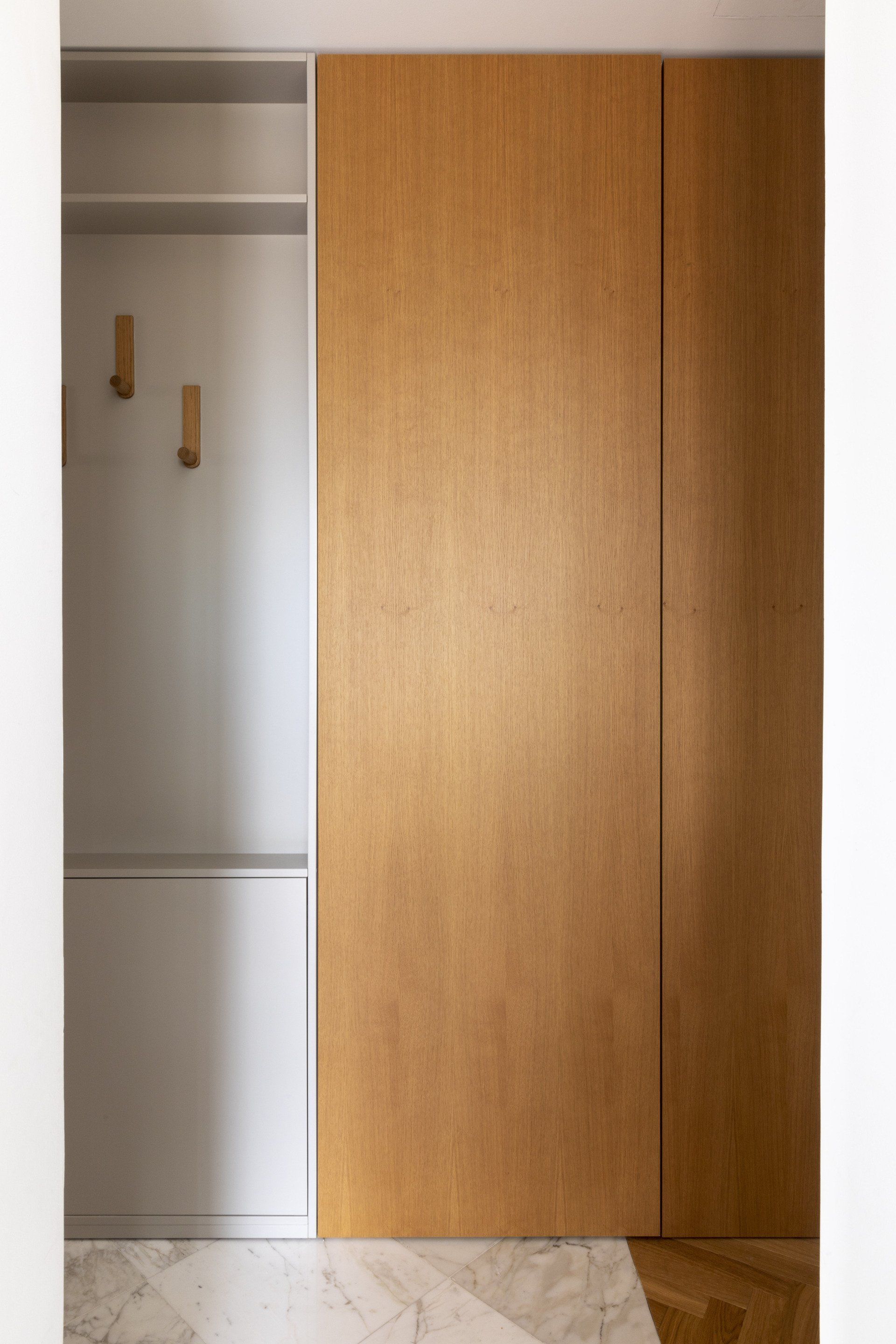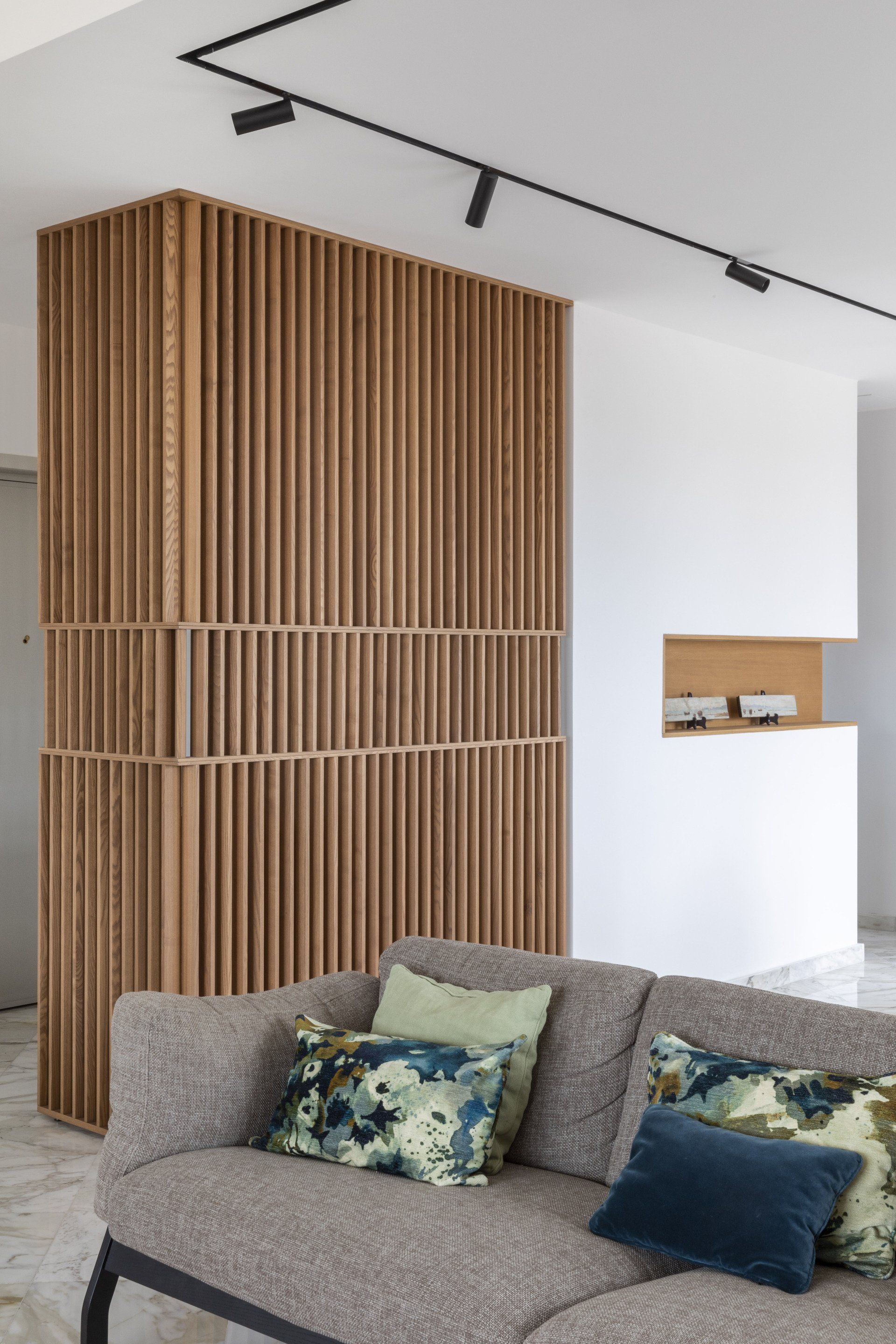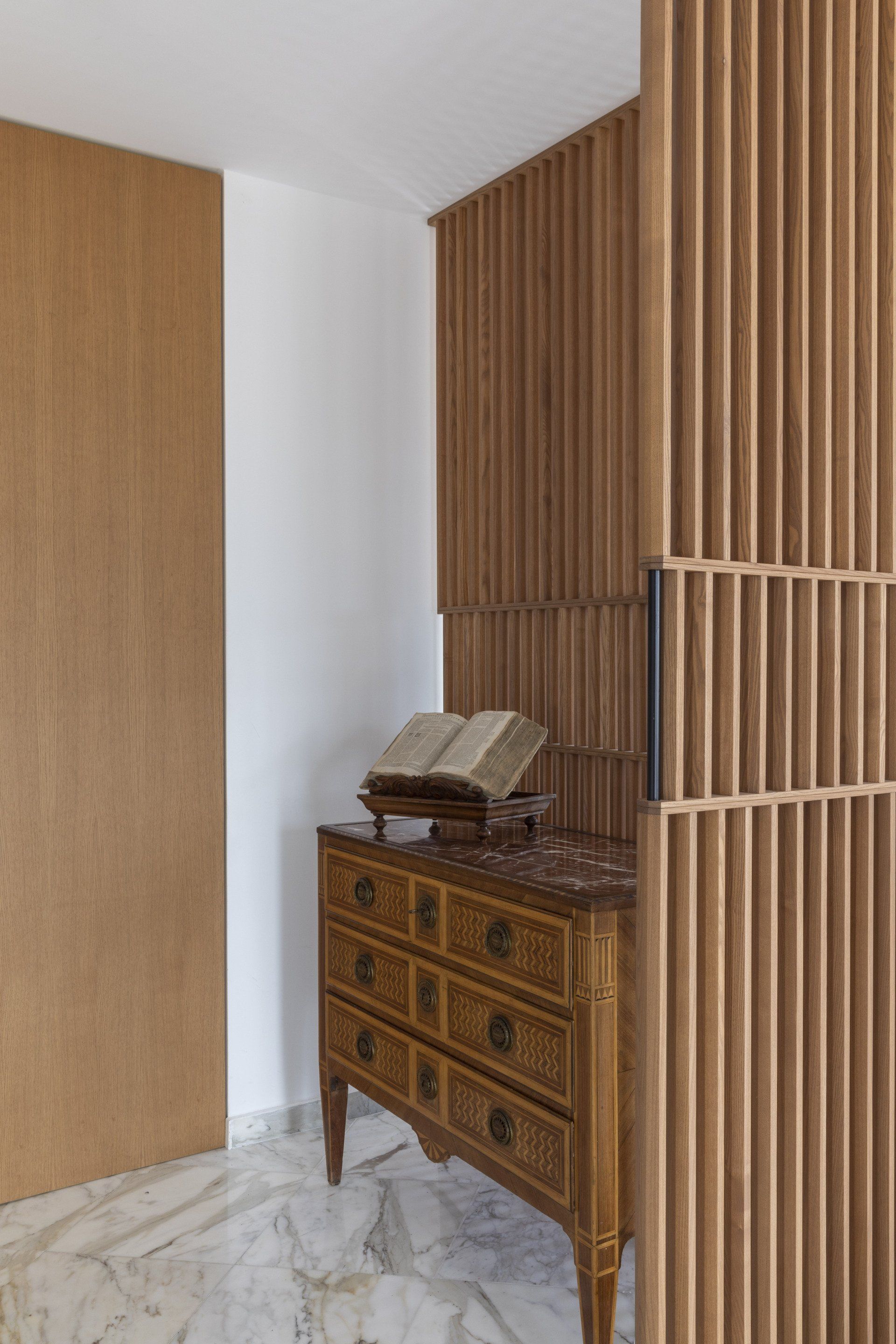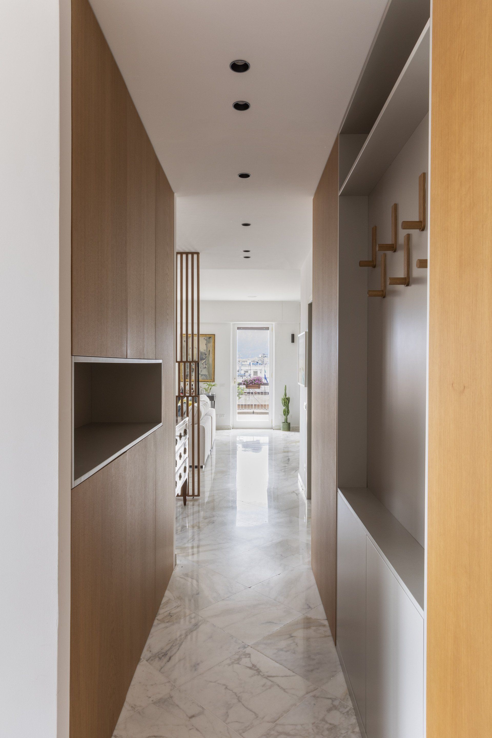 La sagoma irregolare della pianta ha suggerito soluzioni che rendessero abitabili spazi di solito privi di funzione come corridoi e disimpegni. Il grande soggiorno è caratterizzato da una gelosia in legno che scherma la porta di accesso e dai mobili della zona living, realizzati su misura: una grande libreria ed un mobile che inquadra il camino a gas.