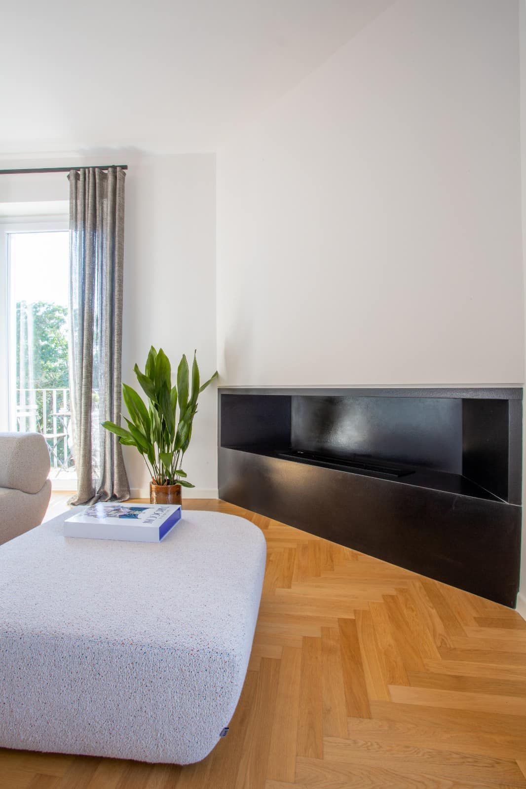 Il progetto si è pertanto occupato di ridistribuire l'organizzazione del soggiorno introducendo un camino angolare rivestito in granito nero.