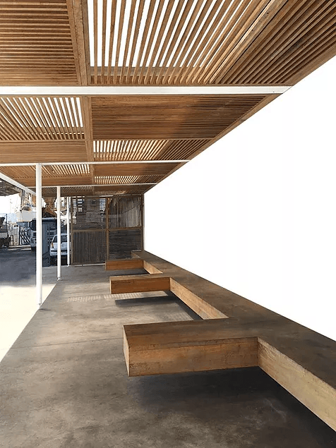 Un lungo sedile in struttura in acciaio e rivestimento in legno completava la dotazione di questo manufatto ispirato alla massima essenzialità