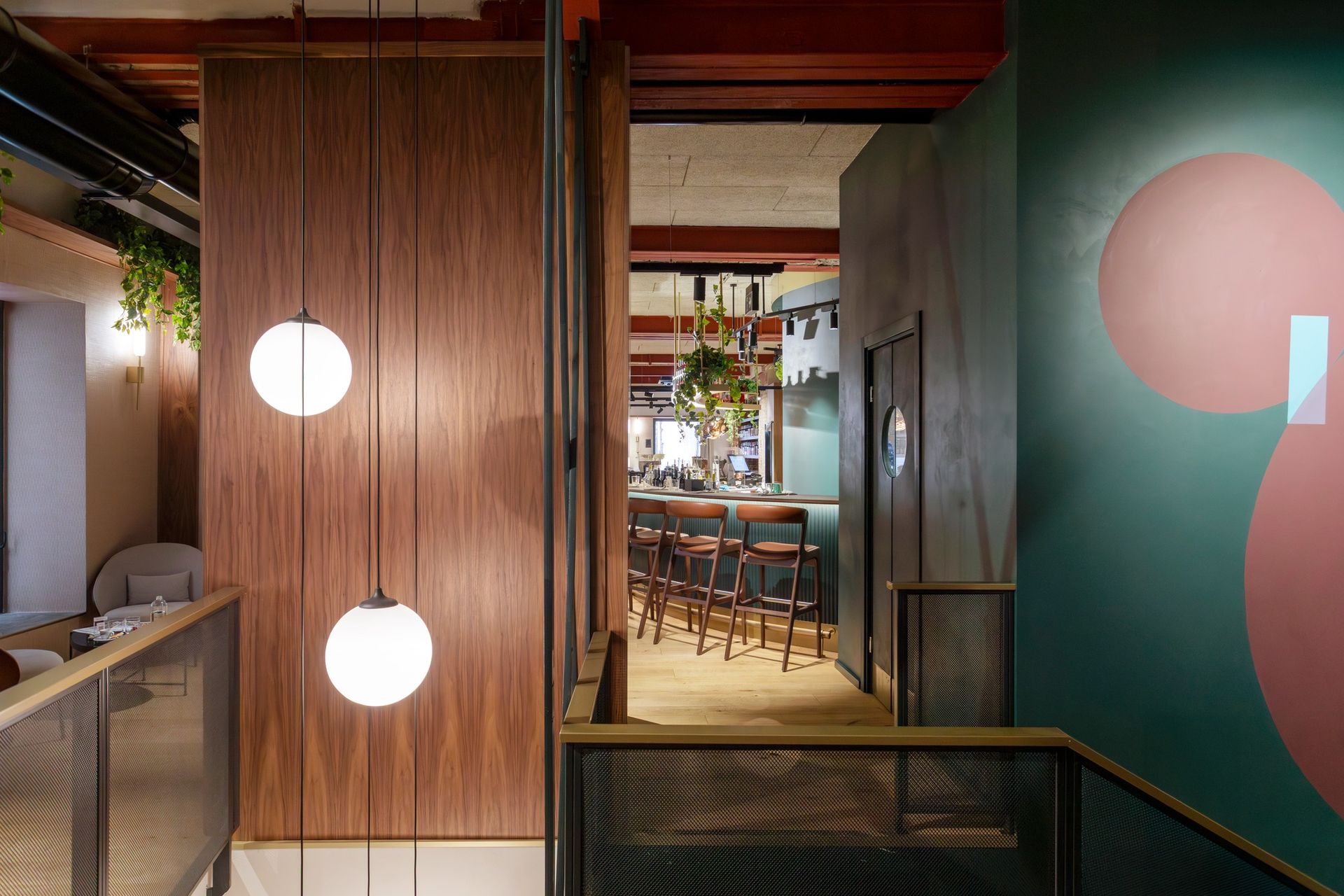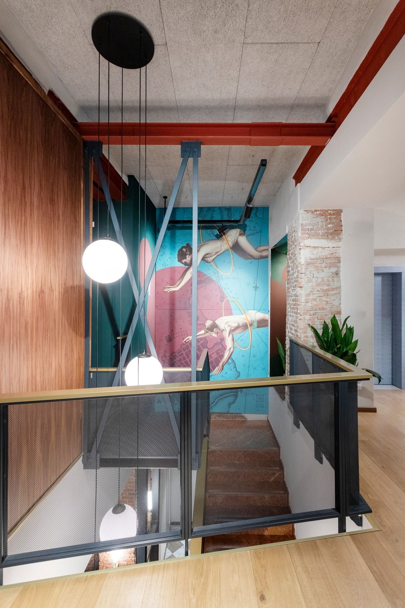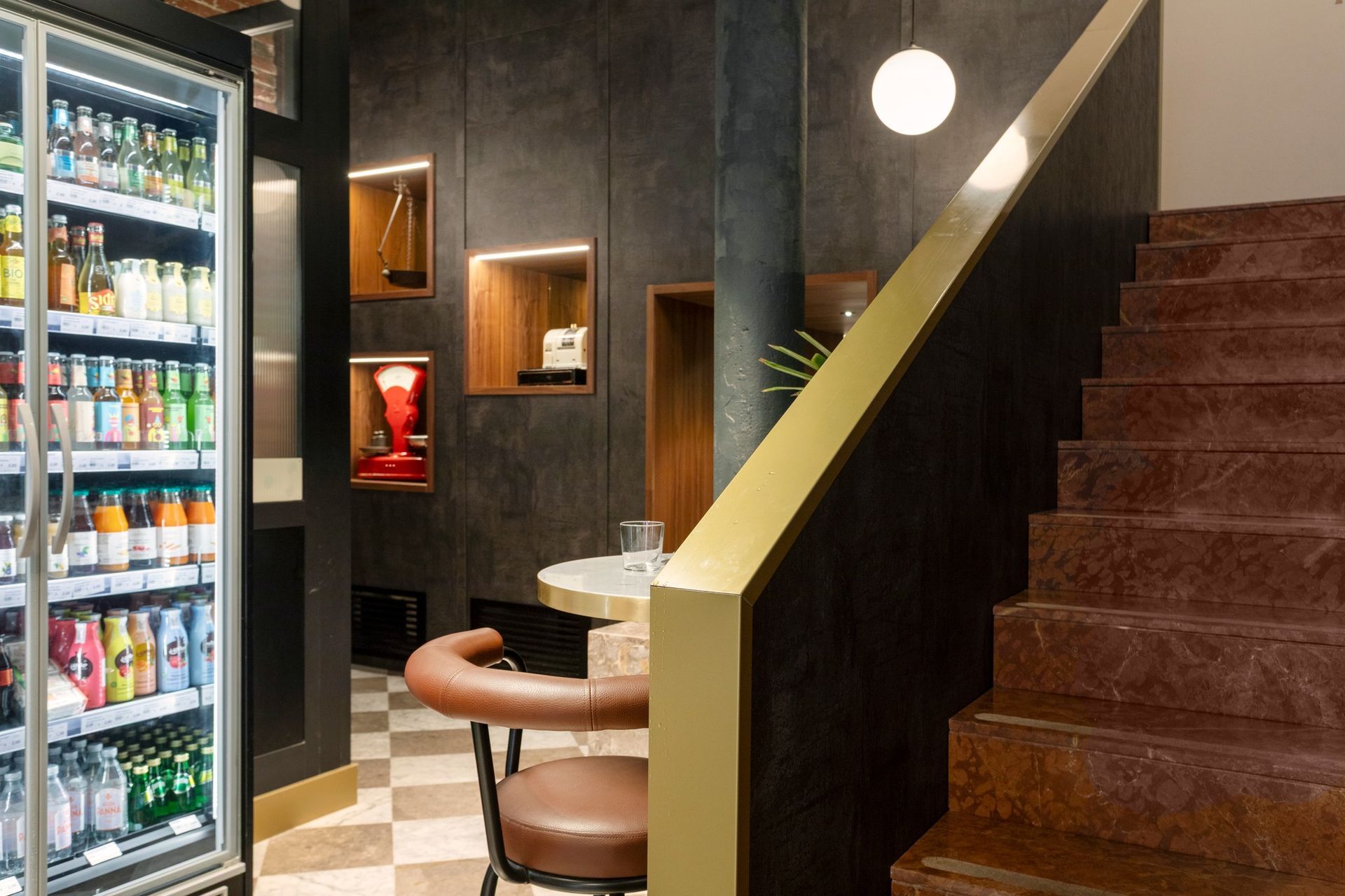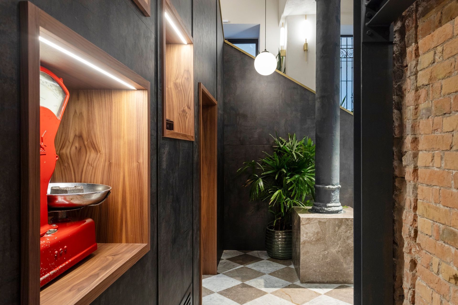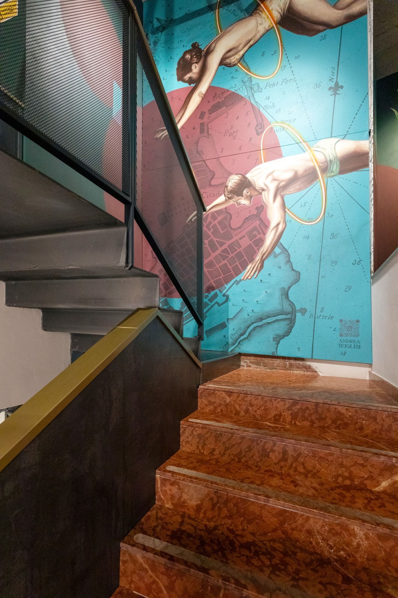 L'intervento di maggior momento è consistito proprio nella scala che ha generato una doppia altezza valorizzata da un'opera pittorica di Andrea Buglisi che celebra Palermo e il suo Centro Storico. Al primo piano, destinato a sala consumazioni e wine bar, si è leggermente cambiato il registro materico optando per un parquet a listelli in adesione al carattere di archeologia industriale che anima il locale che, nel corso della storia è stato sede di varie attività per ultimo lo storico negozio di arte sacra Pantaleone. A questo piano un grande bancone semicircolare ospita il bar e da qui, attraverso due balconi si apprezza una vista invidiabile su piazza Pretoria e sul Cassaro.