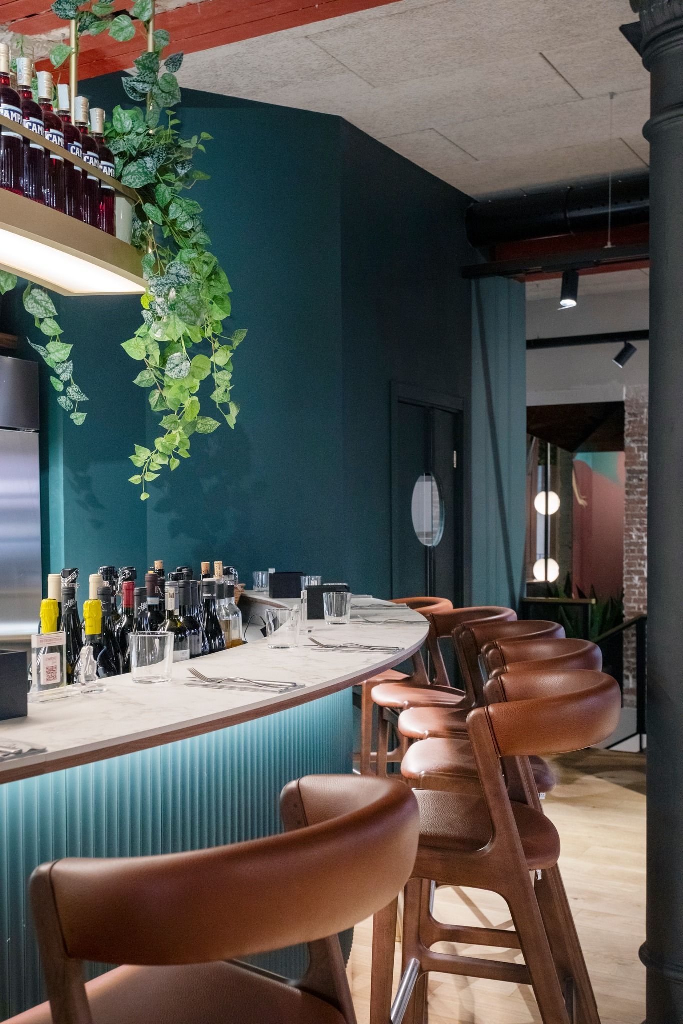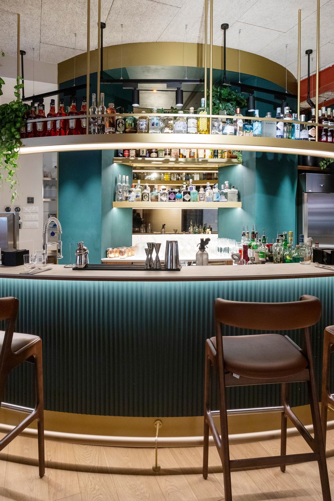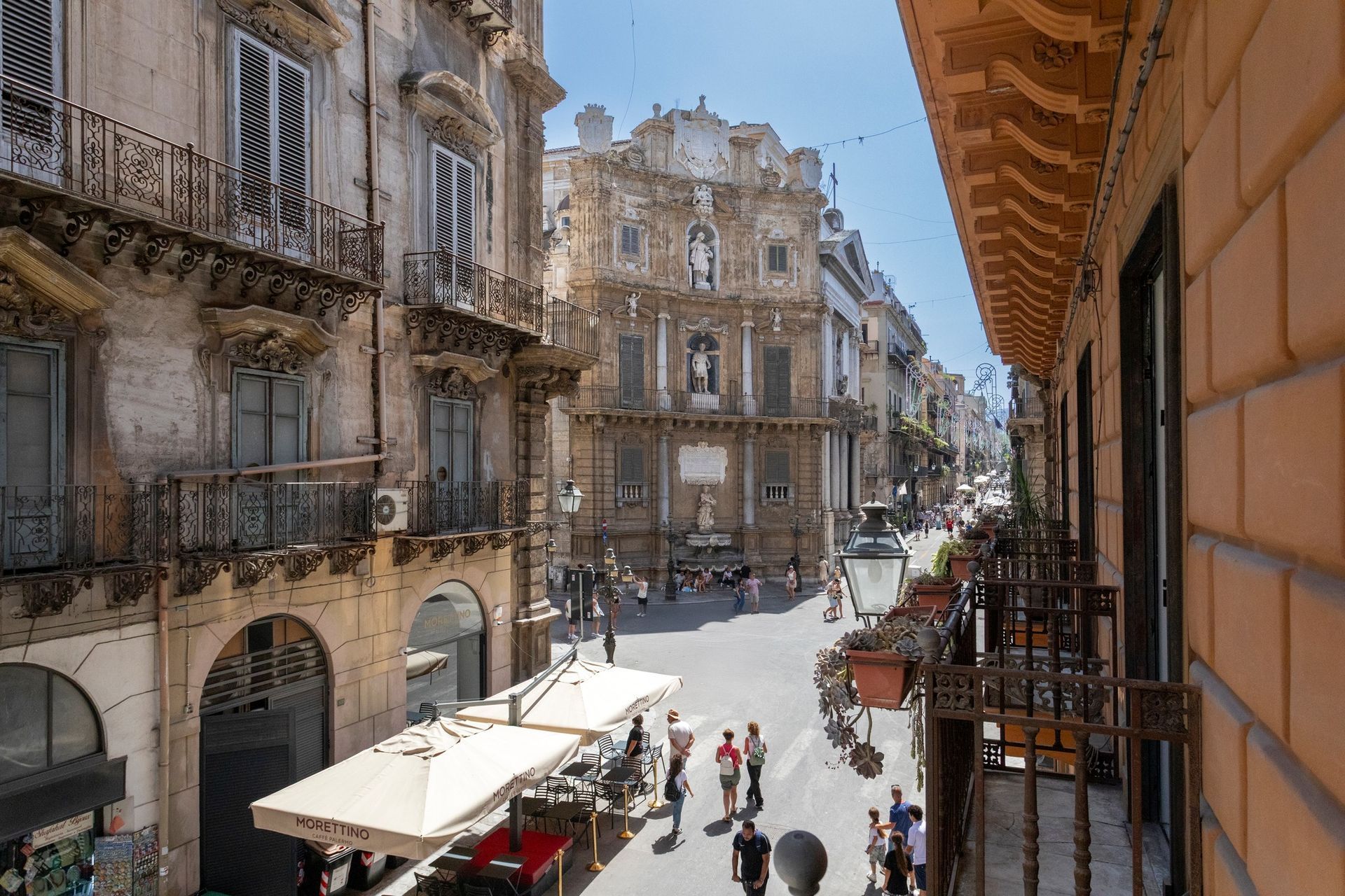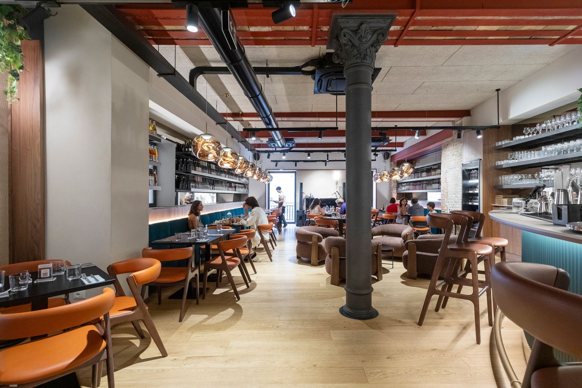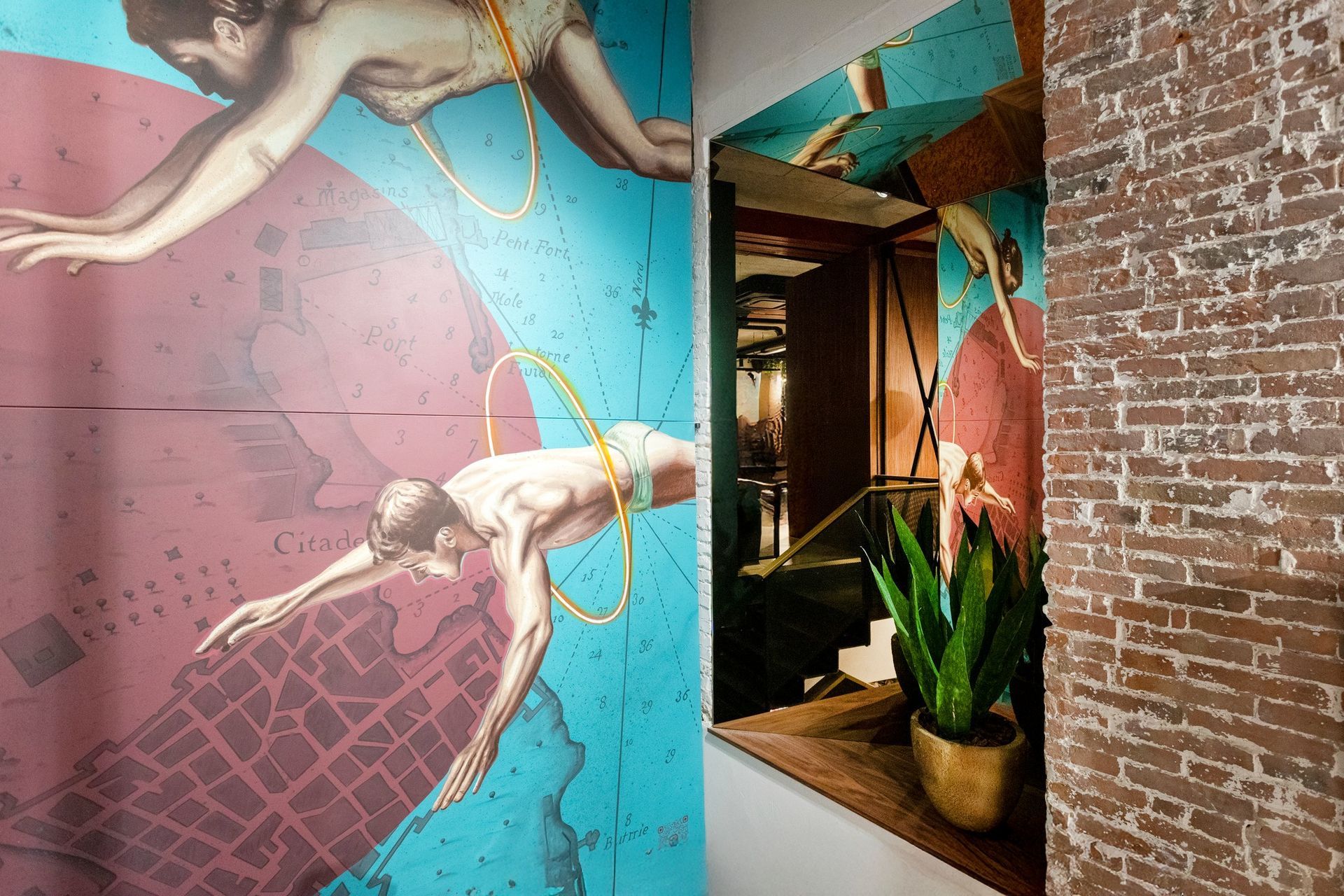 L'intervento di maggior momento è consistito proprio nella scala che ha generato una doppia altezza valorizzata da un'opera pittorica di Andrea Buglisi che celebra Palermo e il suo Centro Storico. Al primo piano, destinato a sala consumazioni e wine bar, si è leggermente cambiato il registro materico optando per un parquet a listelli in adesione al carattere di archeologia industriale che anima il locale che, nel corso della storia è stato sede di varie attività per ultimo lo storico negozio di arte sacra Pantaleone. A questo piano un grande bancone semicircolare ospita il bar e da qui, attraverso due balconi si apprezza una vista invidiabile su piazza Pretoria e sul Cassaro.