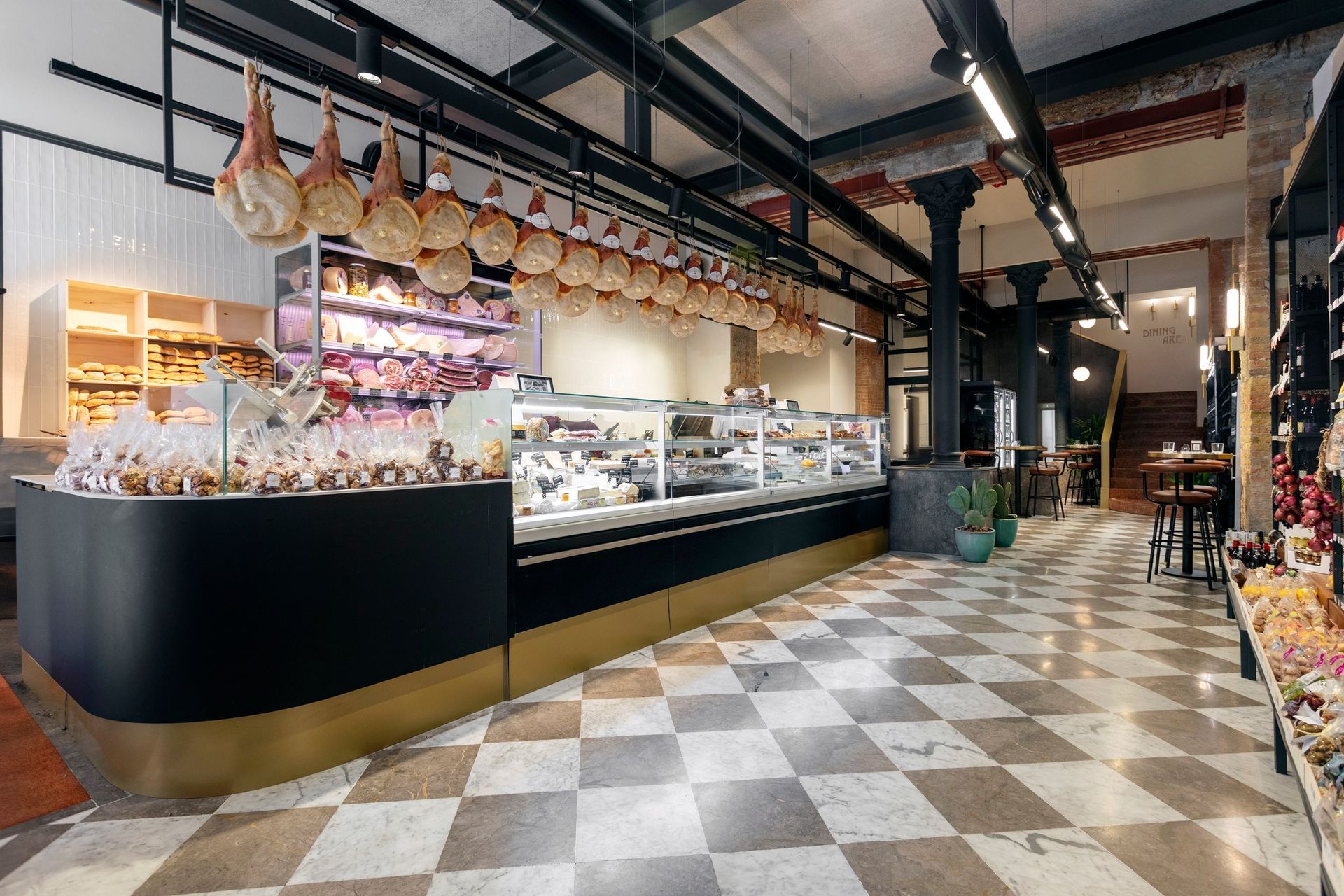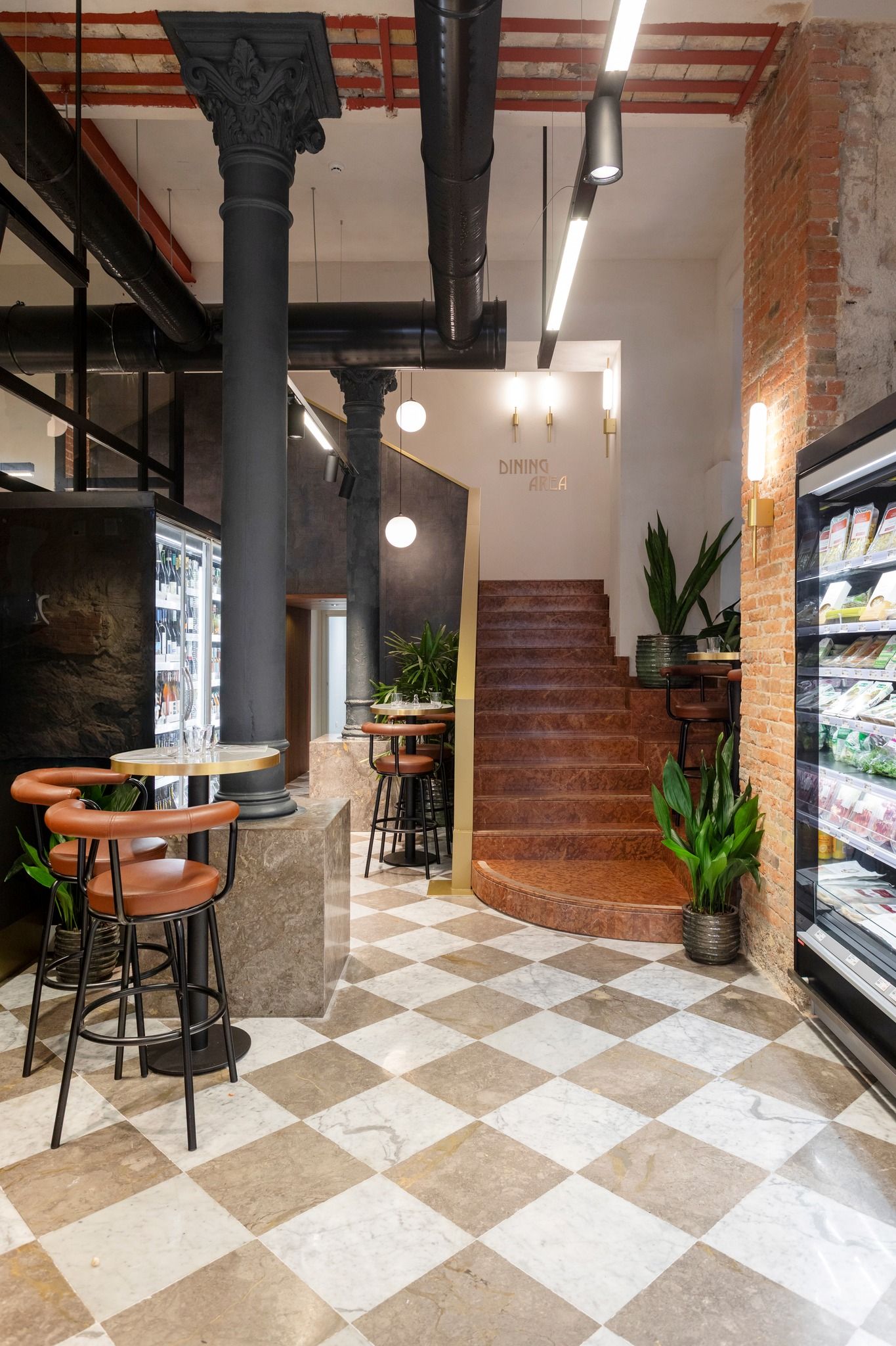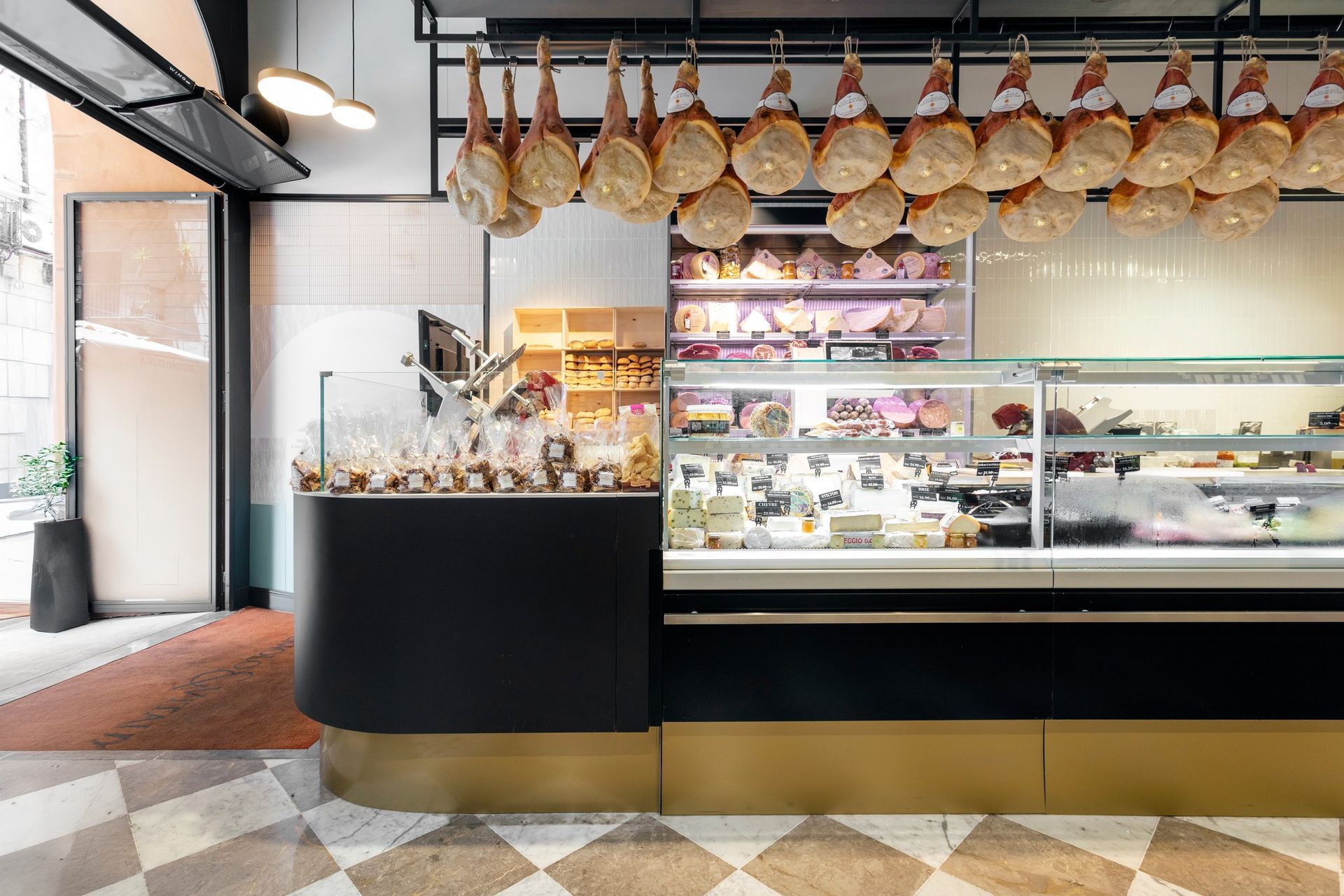 Lo spazio è caratterizzato da un insolito, almeno per Palermo, colonnato in ghisa, che è stato valorizzato come elemento iconico e riconoscibile. Il locale ospita al piano su strada un grande bancone per la vendita e al piano primo un wine bar con zona consumazione. Le pareti in conci di arenaria sono state mantenute a vista, così come a vista sono stati mantenuti gli interventi murari di consolidamento che nel tempo si sono succeduti. Abbiamo lasciato che la storia di questo luogo, posto nel cuore della città, fosse leggibile senza infingimenti o sovrapposizioni. La scelta dei materiali si è orientata verso la tradizione. Per il pavimento del locale di piano terra si è scelta una dama in marmo di Billiemi e Carrara mentre è stata rivestita in marmo rosso siciliano la scala.
