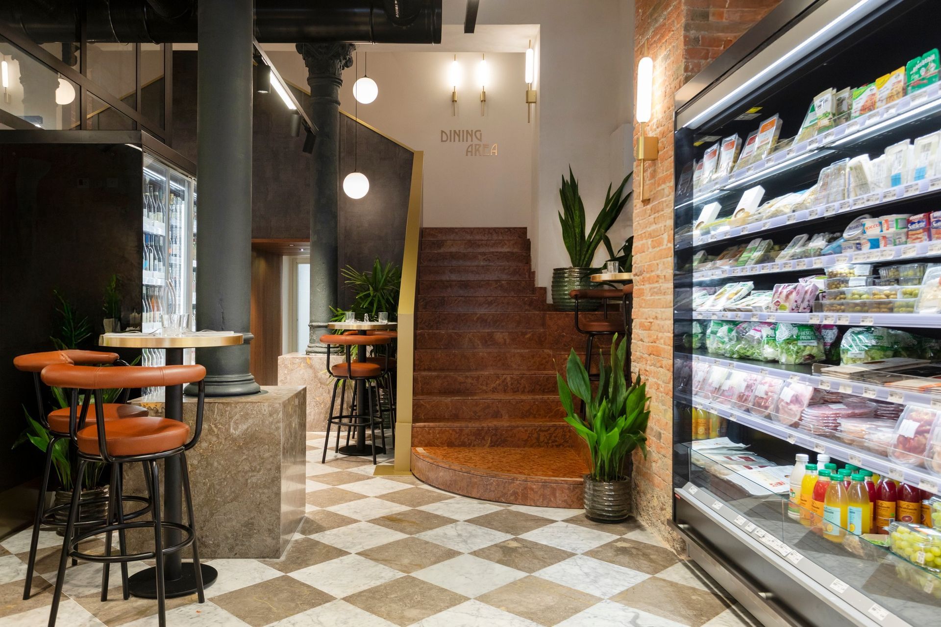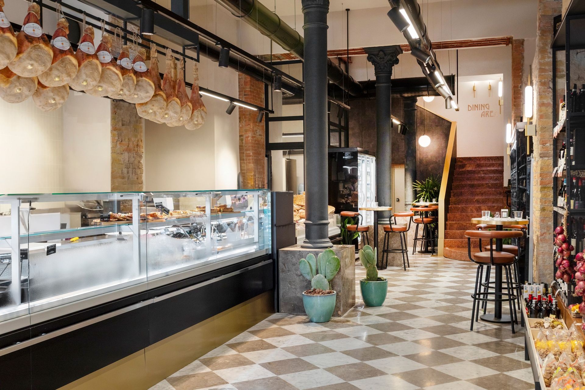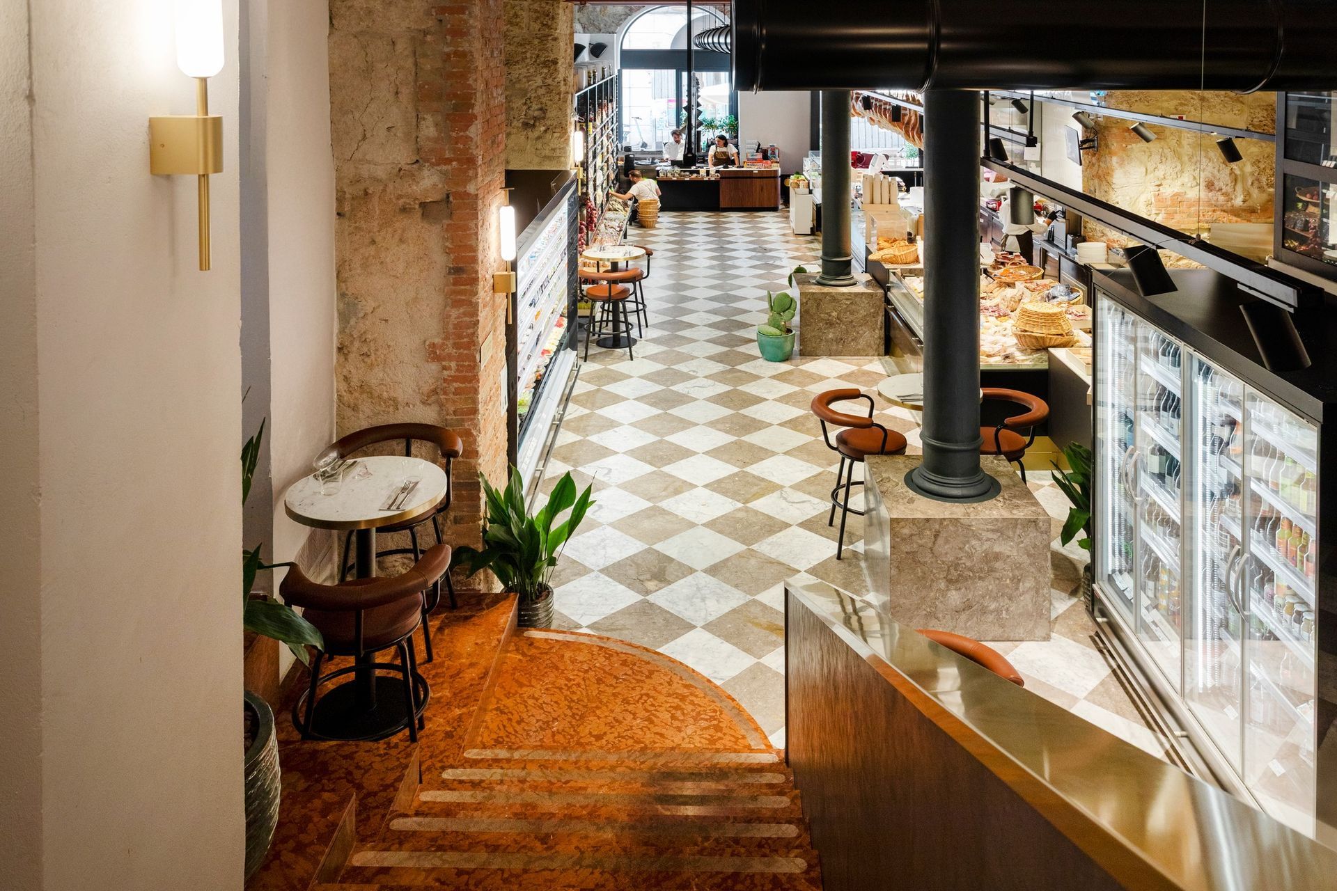 Lo spazio è caratterizzato da un insolito, almeno per Palermo, colonnato in ghisa, che è stato valorizzato come elemento iconico e riconoscibile. Il locale ospita al piano su strada un grande bancone per la vendita e al piano primo un wine bar con zona consumazione. Le pareti in conci di arenaria sono state mantenute a vista, così come a vista sono stati mantenuti gli interventi murari di consolidamento che nel tempo si sono succeduti. Abbiamo lasciato che la storia di questo luogo, posto nel cuore della città, fosse leggibile senza infingimenti o sovrapposizioni. La scelta dei materiali si è orientata verso la tradizione. Per il pavimento del locale di piano terra si è scelta una dama in marmo di Billiemi e Carrara mentre è stata rivestita in marmo rosso siciliano la scala.